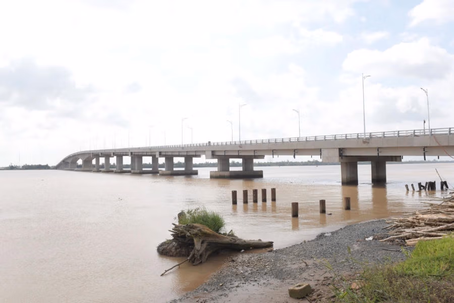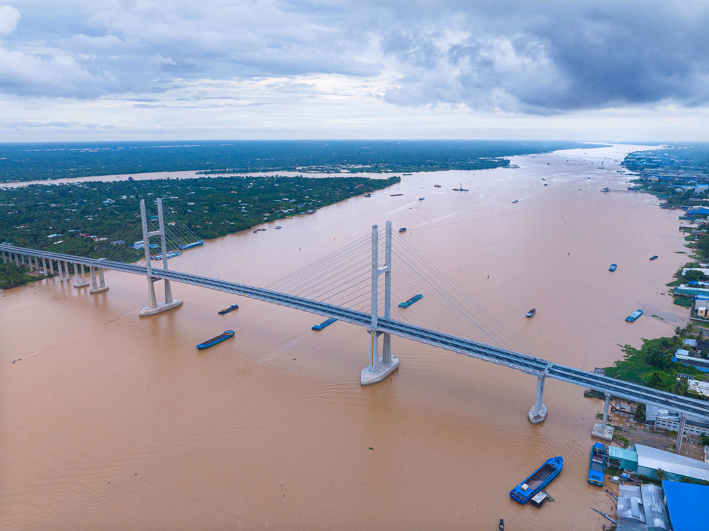 Dự án xây dựng cầu Đại Ngải (gồm Đại Ngải 1 và Đại Ngải 2) là một trong những cây cầu lớn và dài nhất ở phía Nam. Cầu bắc qua dòng chính sông Hậu, nối Trà Vĩnh và Sóc Trăng, nay là tỉnh Vĩnh Long và TP Cần Thơ. Dự án có nguồn vốn gần 8.000 tỷ đồng, đã đưa vào khai thác cầu Đại Ngải 2 hồi cuối tháng 12/2025, trong khi cầu Đại Ngải 1 (liền kề) dự kiến phải tới năm 2028 mới hoàn thành. Ngoài 2 cầu chính, dự án còn một đoạn ngắn đường nằm trên địa bàn cù lao Dung nổi tiếng. Đây cũng là cây cầu thứ 3 bắc qua dòng chính sông Hậu (sau cầu Vàm Cống, cầu Cần Thơ). Ảnh: S.G. 8. Đưa vào khai