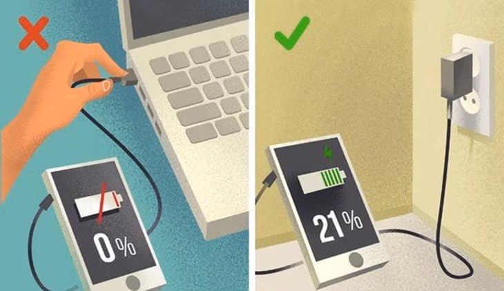 Máy tính xách tay thường được sử dụng để sạc điện thoại, nhưng sẽ mất nhiều thời gian hơn so với sử dụng ổ cắm thông thường và nó không kích hoạt tùy chọn sạc nhanh của pin. Nếu bạn muốn sạc pin nhanh hơn và theo cách tốt nhất có thể, bạn nên sử dụng ổ cắm thông thường.