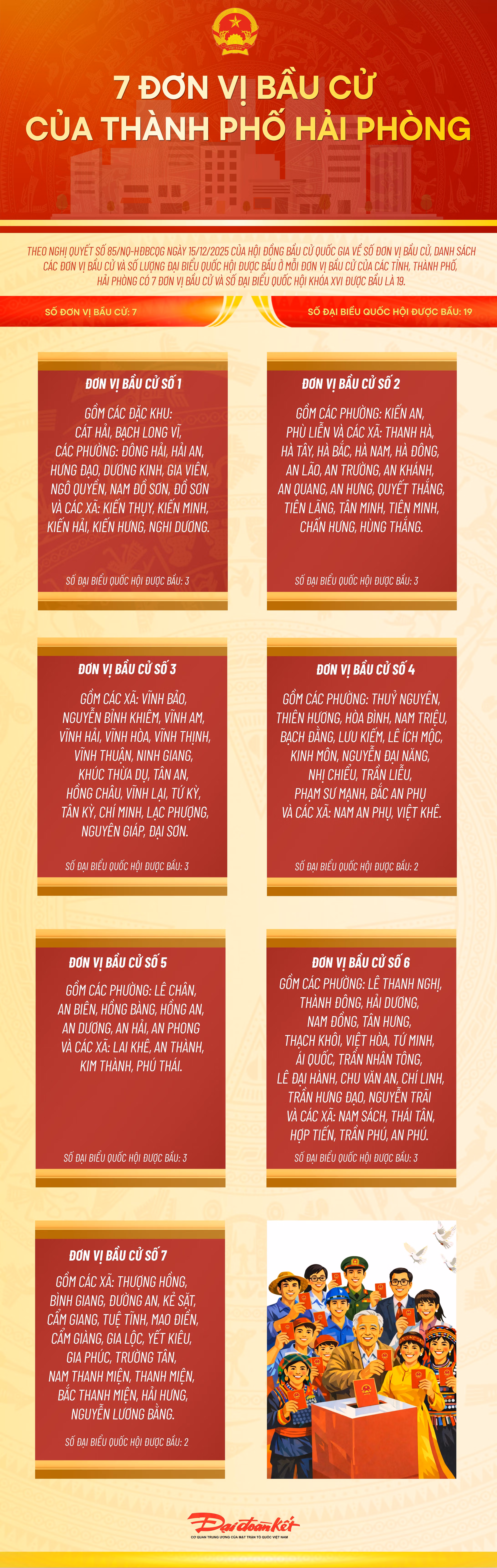 Theo Nghị quyết số 85/NQ-HĐBCQG ngày 15/12/2025 của Hội đồng Bầu cử quốc gia về số đơn vị bầu cử, danh sách các đơn vị bầu cử và số lượng đại biểu Quốc hội được bầu ở mỗi đơn vị bầu cử của các tỉnh, thành phố, Hải Phòng có 7 đơn vị bầu cử và số đại biểu Quốc hội khóa XVI được bầu là 19.