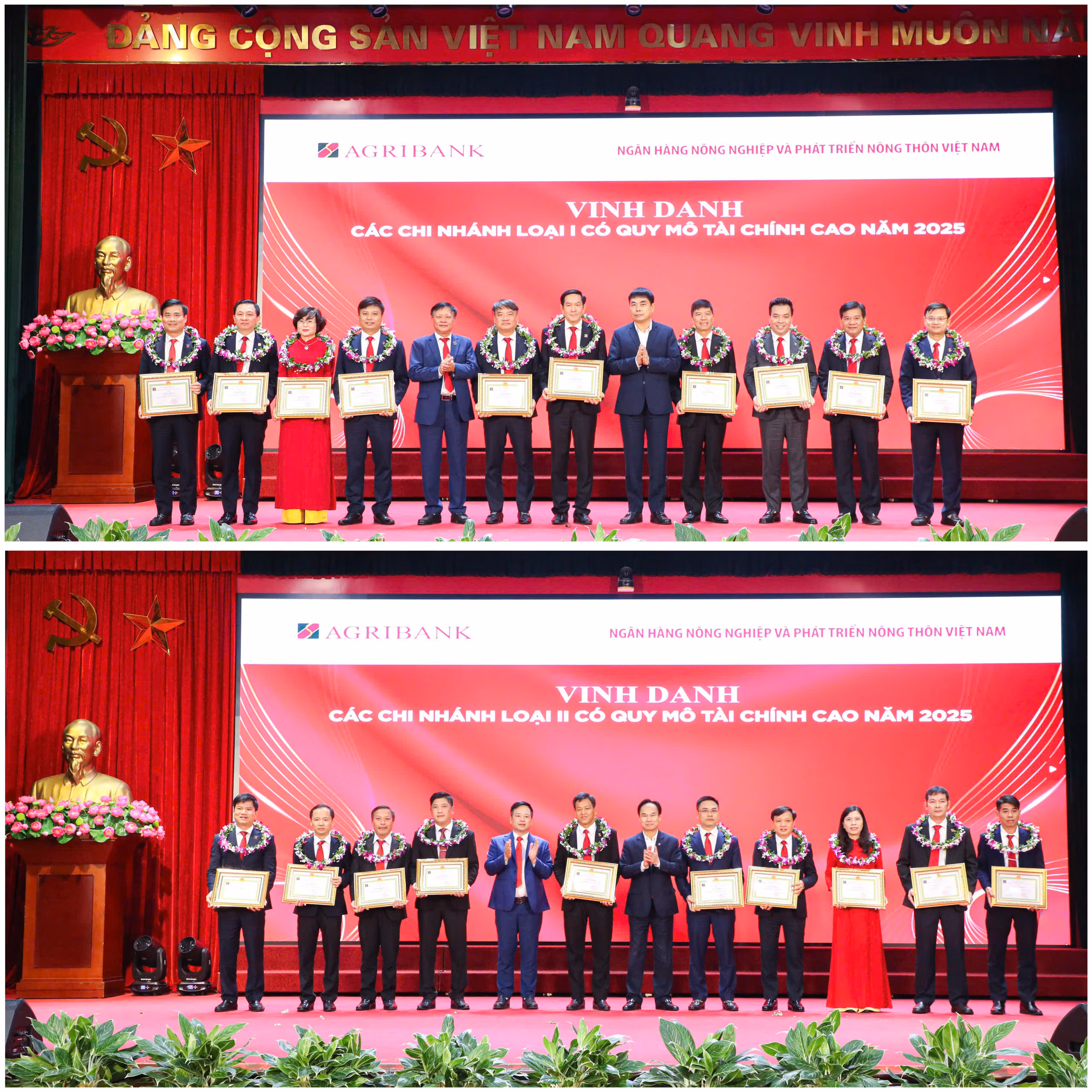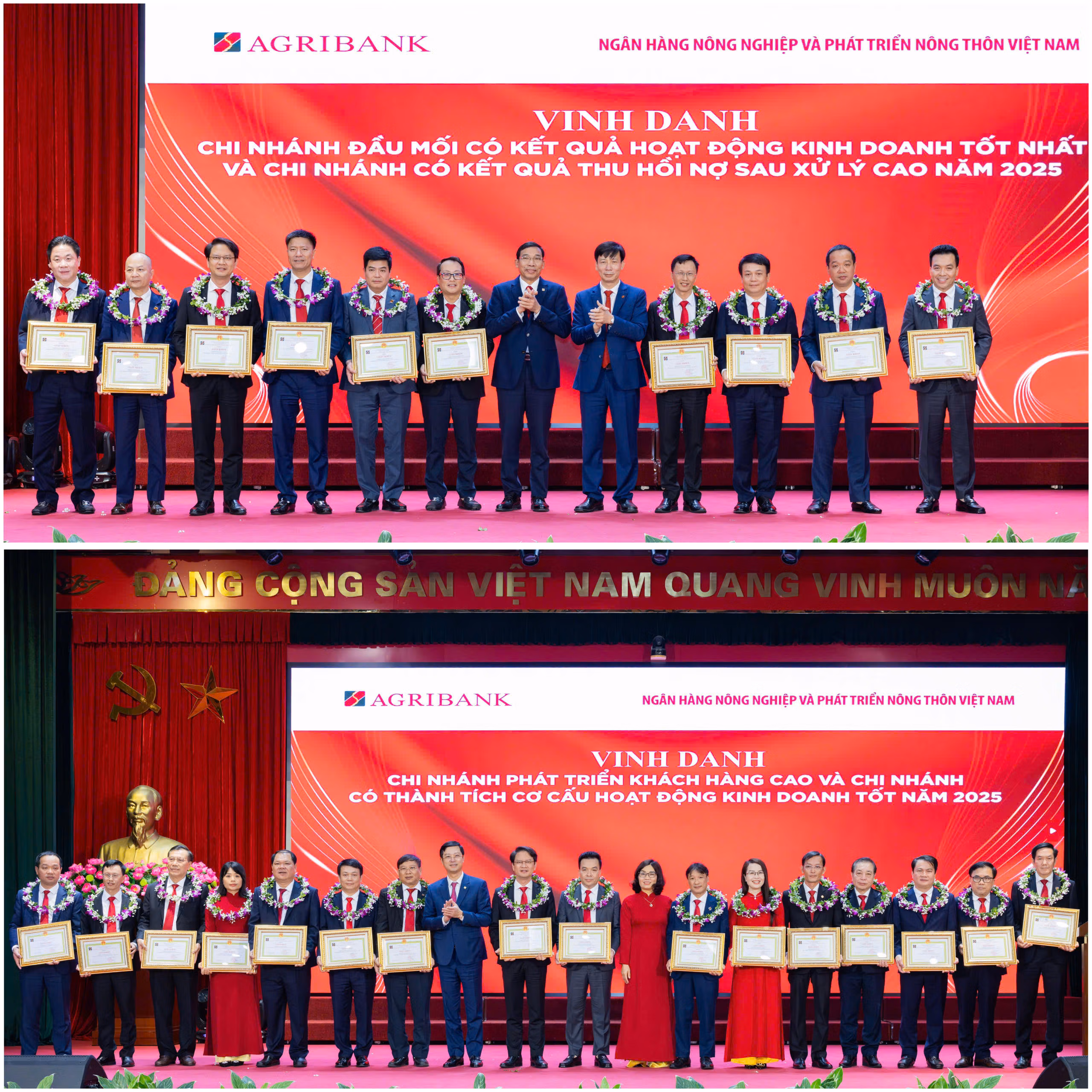 Đồng thời, để kịp thời ghi nhận đóng góp quan trọng của các đơn vị vào kết quả hoàn thành vượt mức các chỉ tiêu kế hoạch kinh doanh năm 2025 của hệ thống, tại Hội nghị, Agribank đã tổ chức trao thưởng, vinh danh các đơn vị xuất sắc, tiêu biểu đạt Giải Nhất, Nhì, Ba toàn hệ thống; các chi nhánh có quy mô tài chính cao, kết quả tăng trưởng nổi bật về nguồn vốn, tín dụng; các chi nhánh có kết quả hoạt động hiệu quả, thu hồi nợ sau xử lý cao; đồng thời biểu dương các tập thể tại Trụ sở chính có thành tích đặc biệt xuất sắc trong công tác tham mưu, điều hành, góp phần quan trọng vào việc hoàn thành các mục tiêu, nhiệm vụ kinh doanh chung của Agribank.
