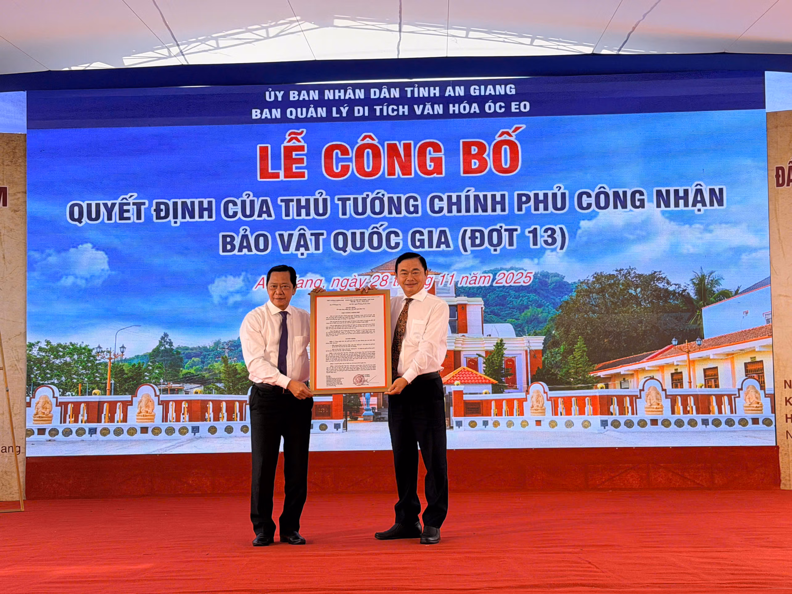 Ngày 28/11, tại xã Óc Eo, tỉnh An Giang, Ban Quản lý Di tích Văn hóa Óc Eo đã long trọng tổ chức lễ công bố Quyết định của Thủ tướng Chính phủ công nhận thêm hai bảo vật Quốc gia thuộc nền văn hóa Óc Eo.