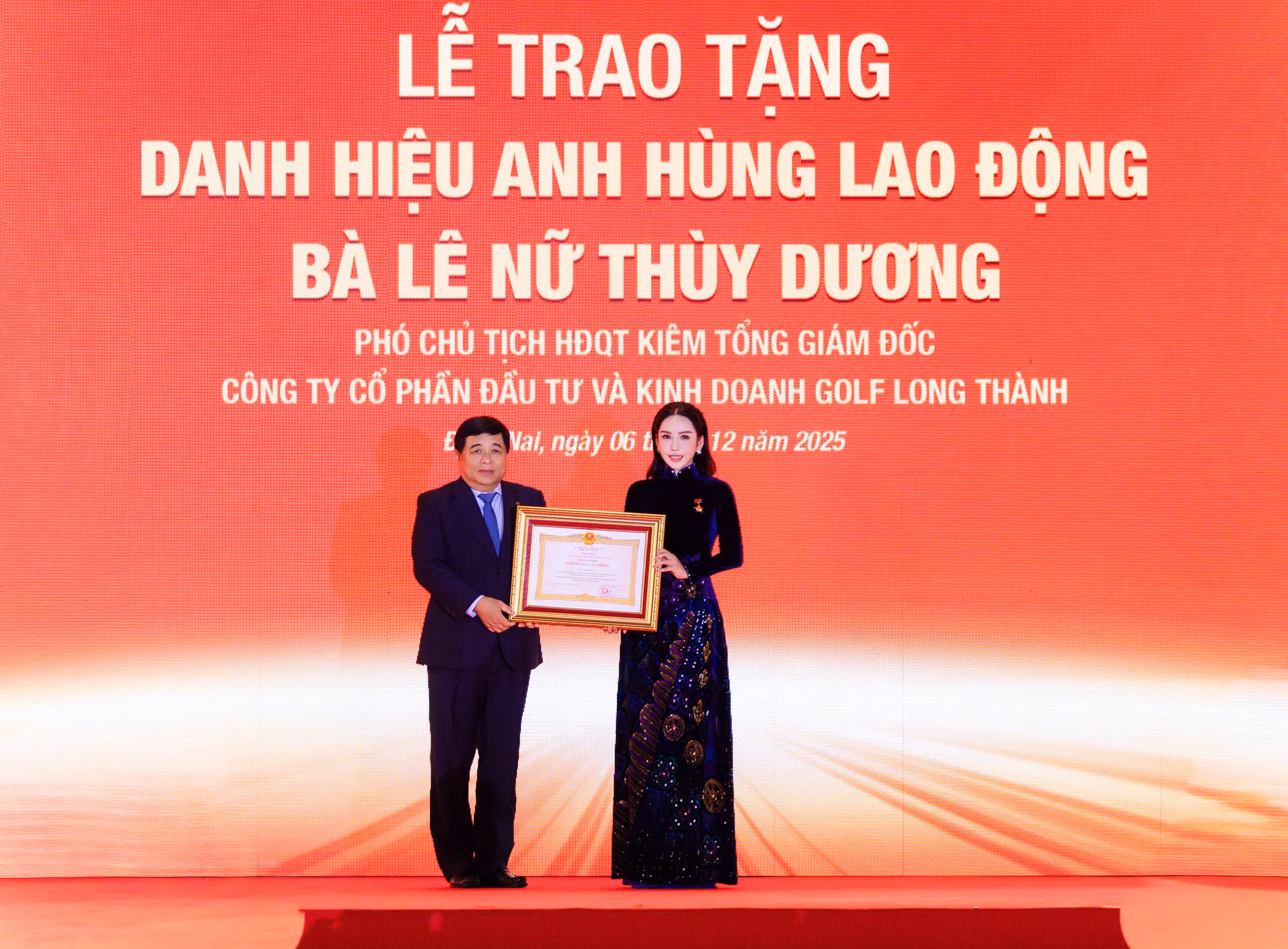 Sáng 27/12, tại Đại hội Thi đua yêu nước lần thứ XI, bà Lê Nữ Thùy Dương - Phó Chủ tịch HĐQT kiêm Tổng Giám đốc Tập đoàn KN Holdings (Công ty Cổ phần Đầu tư và Kinh doanh Golf Long Thành) một lần nữa được tuyên dương, vinh danh cùng các tập thể, cá nhân đã được phong tặng danh hiệu Anh hùng Lao động trong năm 2025.