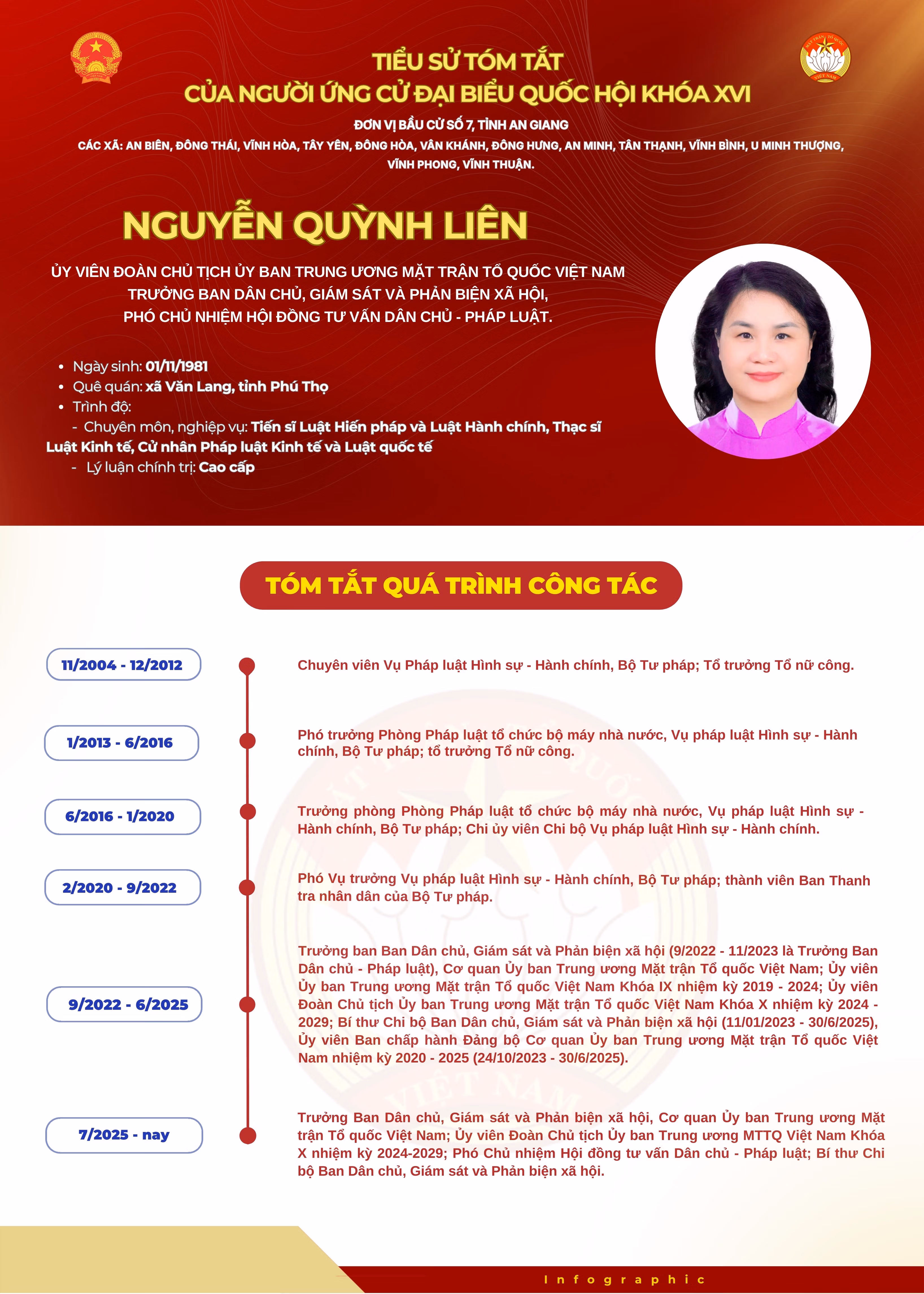Bà Nguyễn Quỳnh Liên - Ủy viên Đoàn Chủ tịch, Trưởng ban Ban Dân chủ, Giám sát và Phản biện xã hội, Phó Chủ nhiệm Hội đồng tư vấn Dân chủ - Pháp luật cơ quan UBTƯ MTTQ Việt Nam ứng cử tại tỉnh An Giang, đơn vị bầu cử số 7 gồm các xã: An Biên, Đông Thái, Vĩnh Hòa, Tây Yên, Đông Hòa, Vân Khánh, Đông Hưng, An Minh, Tân Thạnh, Vĩnh Bình, U Minh Thượng, Vĩnh Phong, Vĩnh Thuận.