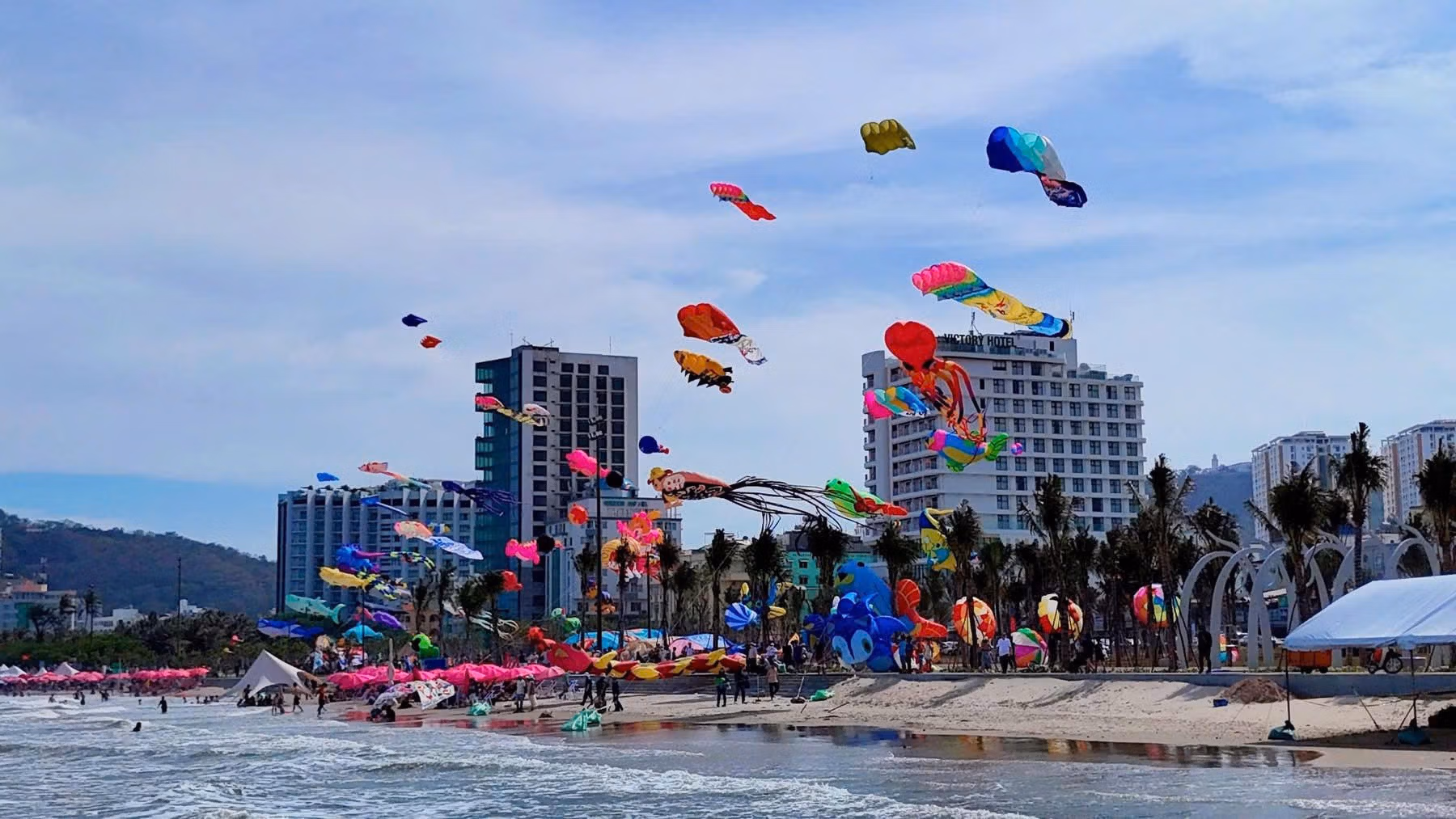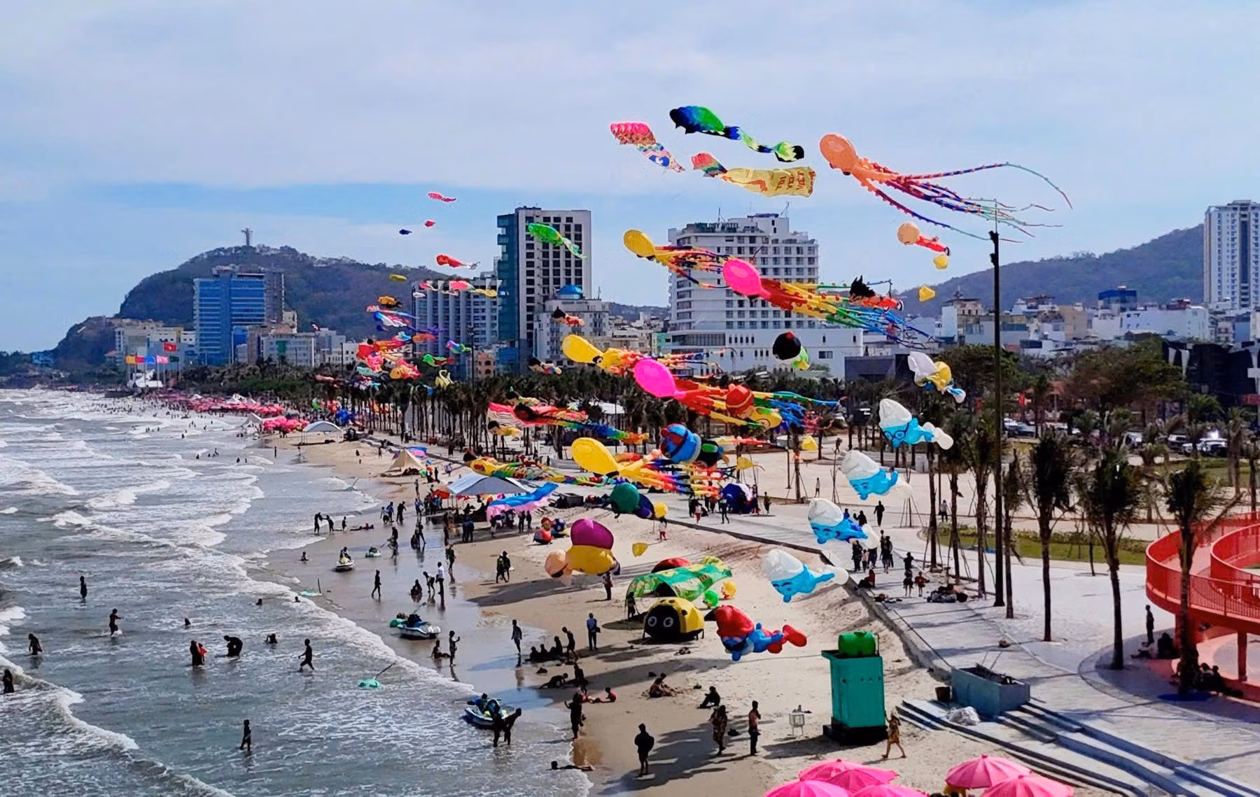400 con diều lớn nhiều màu sắc tung bay trên khắp bầu trời khu vực bãi Sau – công trình Công viên bãi Sau TP Vũng Tàu mới đưa vào sử dụng tạm để phục vụ du khách cho lễ 30-4 và 1-5. Tạo nên một bức tranh đầy màu sắc.