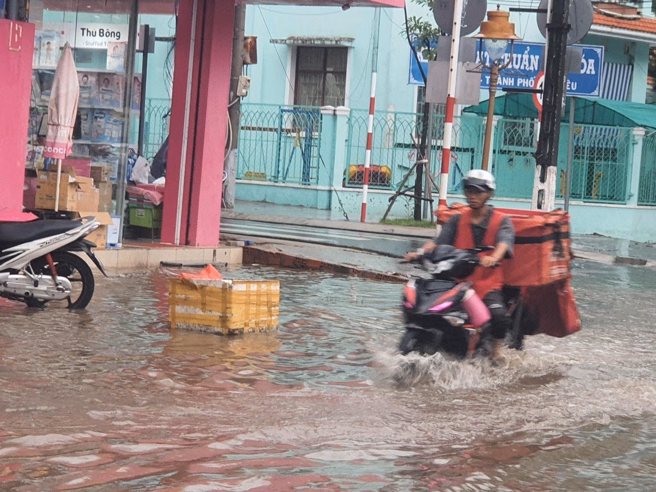 Trên đường Trần Phú, mưa lớn gây ngập sâu nhiều đoạn, nước dâng cao ngập hơn nửa bánh xe máy khiến hàng loạt xe chết máy, nhiều người dân phải dựng tạm xe bên đường chờ nước rút hoặc dắt bộ xe qua đoạn ngập. Tình trạng ngập diện rộng, nhiều tiểu thương phải vất vả che chắn gian hàng, di dời phương tiện để tránh bị nước làm hỏng.