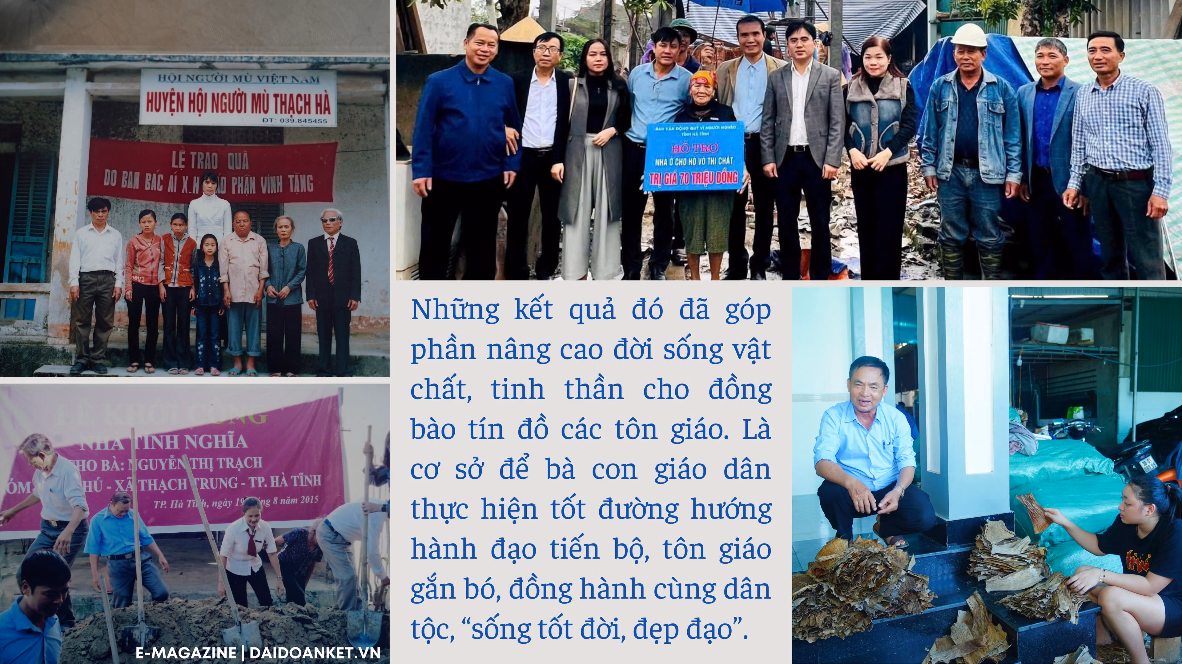 Cùng với sự hỗ trợ của quỹ “Vì người nghèo” các cấp, bà con giáo dân còn đóng góp về tinh thần và vật chất, xây dựng mới 486 nhà Đại đoàn kết với tổng giá trị trên 43 tỷ đồng. Trận lũ lịch sử năm 2020, hưởng ứng lời kêu gọi của Tổng Giám mục Giáo phận Hà Tĩnh, các vị linh mục quản hạt, quản xứ, Ban Caritas Giáo phận, cùng với tấm lòng nhân đạo, từ thiện, bác ái, nhân văn sâu sắc của đồng bào Công giáo, từ các hoạt động của “Quỹ từ thiện, bác ái”, bằng tinh thần nhường cơm sẻ áo, đồng bào Công giáo đã tích cực đóng góp lương thực, thực phẩm, thuốc chữa bệnh, tổ chức hàng trăm lượt đoàn đến hỏi thăm, giúp đỡ nhân dân vùng lũ.
