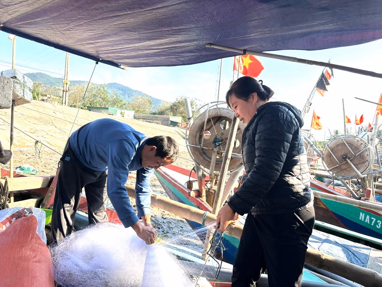 Đang thoăn thoắt gỡ lưới, sắp xếp nhu yếu phẩm đưa lên thuyền, chị Nguyễn Thị Xuân (43 tuổi, phường Quỳnh Phương, thị xã Hoàng Mai, Nghệ An) chia sẻ: Hơn 20 năm nay, vợ chồng chị “định cư” ở cảng cá này để mưu sinh. Vốn sinh ra ở vùng biển ngang, nơi có Cảng cá Quỳnh Phương sầm uất, nên vợ chồng chị Xuân được bố mẹ truyền nghề và “ngấm” nghề đánh bắt hải sản từ nhỏ.