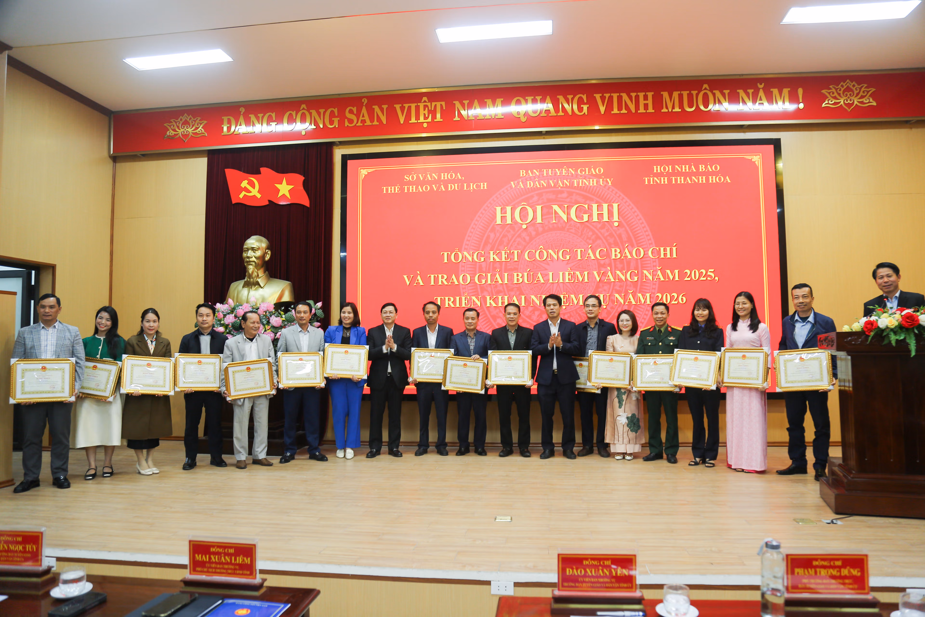 Chiều 26/12, tại phường Hạc Thành, Ban Tuyên giáo và Dân vận Tỉnh ủy phối hợp với Sở Văn hóa, Thể thao và Du lịch, Hội Nhà báo tỉnh Thanh Hóa tổ chức hội nghị tổng kết công tác báo chí và trao giải búa liềm vàng năm 2025, triển khai nhiệm vụ trọng tâm năm 2026.