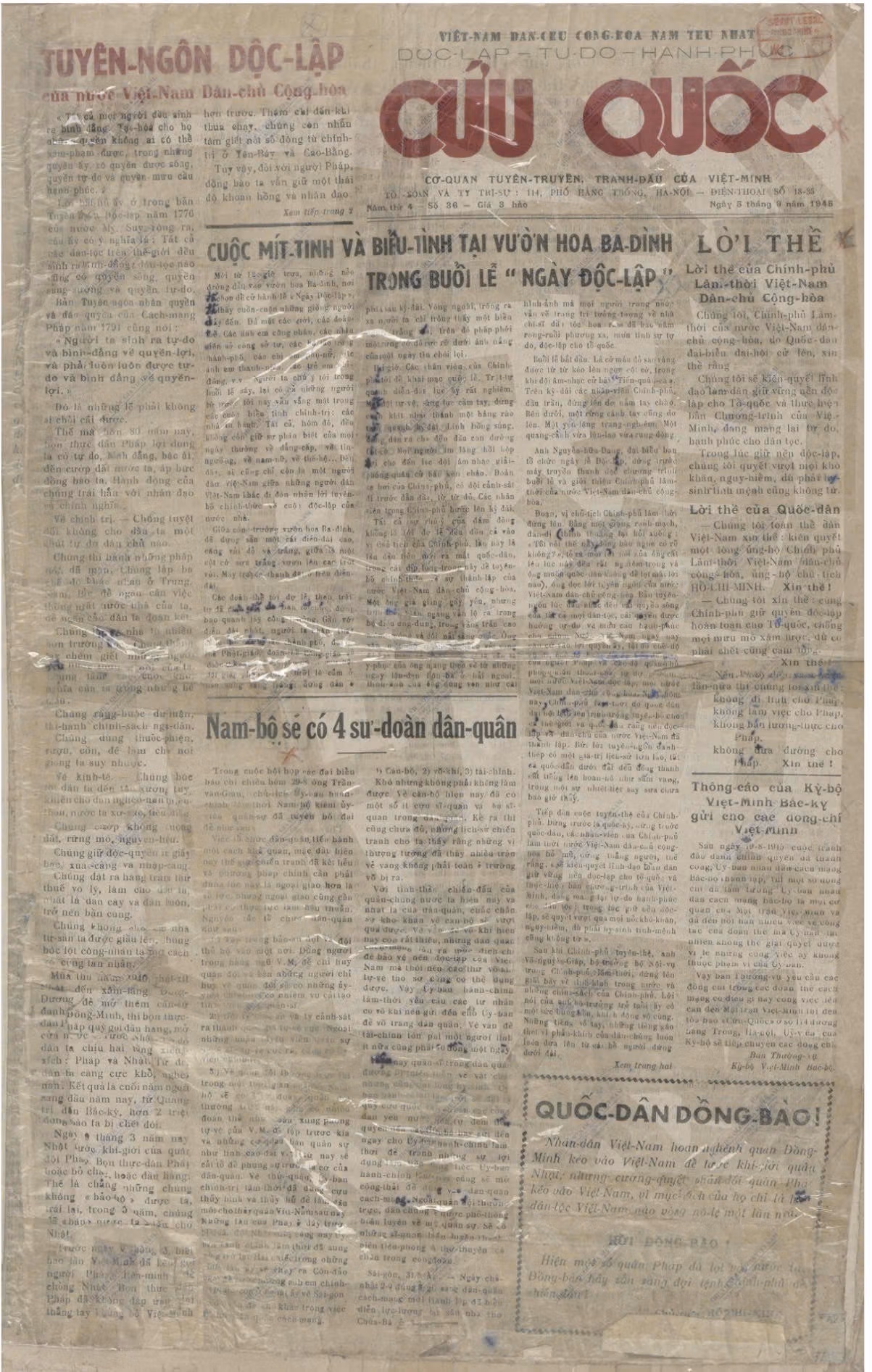 Trong không khí hân hoan của Ngày Độc lập 2/9/1945, Báo Cứu Quốc đã gánh vác một trọng trách lịch sử. Số báo 36, ra ngày 5/9/1945, đã vinh dự đăng tải toàn văn bản Tuyên ngôn Độc lập của nước Việt Nam Dân chủ Cộng hòa - bản tuyên ngôn bất hủ do Chủ tịch Hồ Chí Minh đọc tại Quảng trường Ba Đình. Việc đăng tải kịp thời này không chỉ đơn thuần là hành động đưa tin mà còn là một hành động pháp lý và chính trị, củng cố tính hợp pháp và hợp hiến của Nhà nước Việt Nam Dân chủ Cộng hòa trước quốc dân và thế giới. Cùng với Tuyên ngôn Độc lập, số báo này còn đăng tải lời Tuyên thệ của Chính phủ lâm thời và Lời thề của Quốc dân, thể hiện quyết tâm sắt đá bảo vệ nền độc lập dân tộc. Những tài liệu quý giá này đã trở thành nền tảng tư tưởng và pháp lý cho một quốc gia độc lập, tự do.