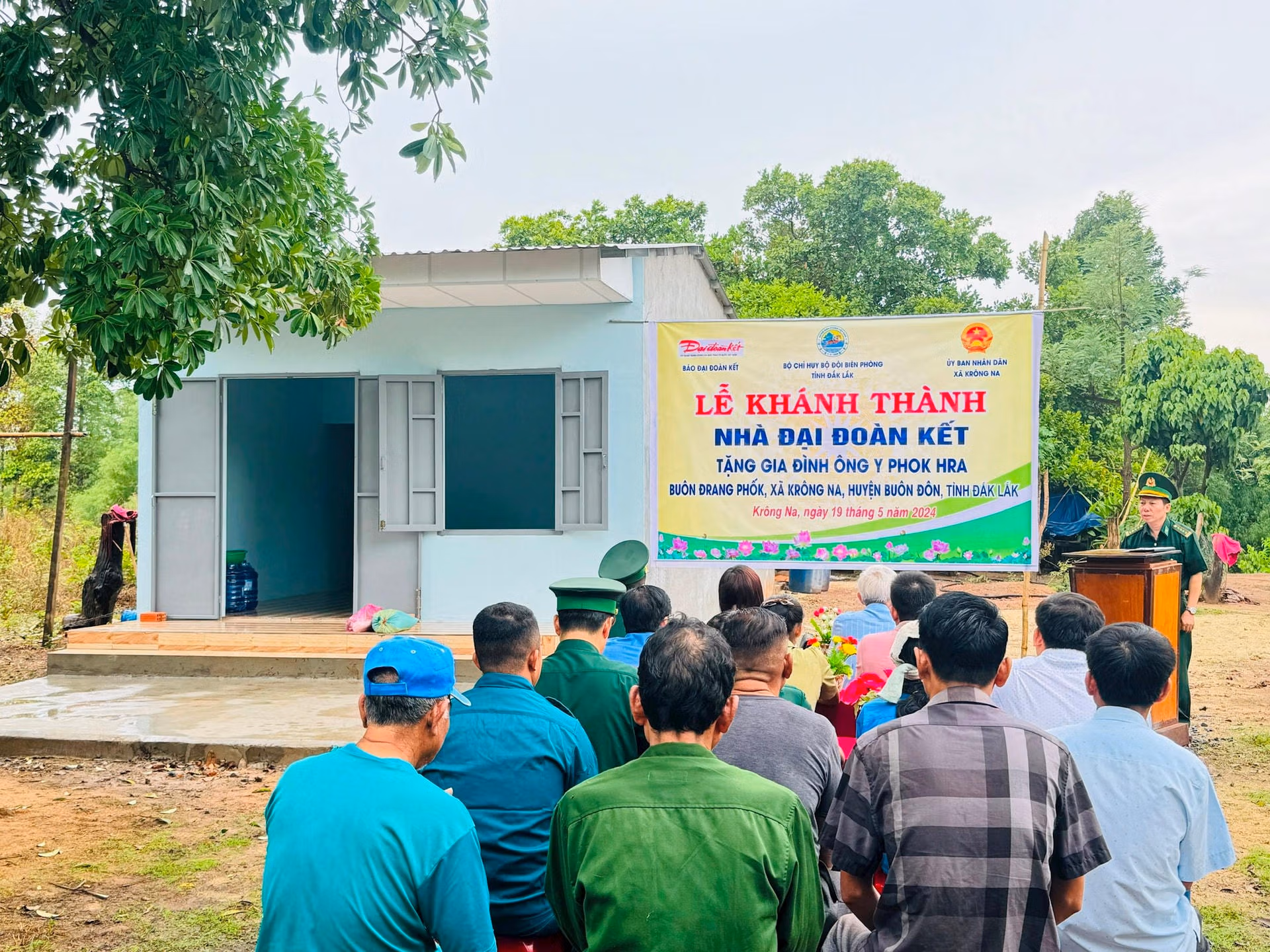 Phát biểu tại buổi lễ, Đại tá Đỗ Quang Thấm, Chính ủy BĐBP Đắk Lắk cho biết, trong thời gian qua, BĐBP Đắk Lắk đã phối hợp triển khai nhiều hoạt động hướng về biên giới, trong đó có ngôi nhà Đại đoàn kết dành tặng cho nhân dân các xã biên giới, nhằm chia sẻ những hoàn cảnh khó khăn với nhân dân khu vực biên giới, giúp đồng bào ổn định đời sống, gắn bó với biên giới. Chúng tôi cũng mong muốn gia đình ông Y Phok Hra đón nhận tình cảm này, gìn giữ ngôi nhà, tiếp tục phát huy truyền thống của địa phương, cùng nhân dân trong buôn đoàn kết, chấp hành tốt chủ trương của Đảng, chính sách pháp luật của nhà nước, cùng BĐBP bảo vệ vững chắc chủ quyền lãnh thổ an ninh biên giới quốc gia.