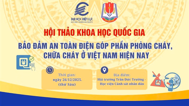 Trường Đại học Điện lực phối hợp với Học viện Cảnh sát Nhân dân đồng tổ chức Hội thảo khoa học Quốc gia “Bảo đảm an toàn điện góp phần phòng cháy, chữa cháy ở Việt Nam hiện nay”, dự kiến diễn ra vào ngày 26/12/2025 tại Hội trường Trần Đức Trường – Học viện Cảnh sát Nhân dân, phố Phạm Văn Nghị, phường Đông Ngạc, Thành phố Hà Nội.