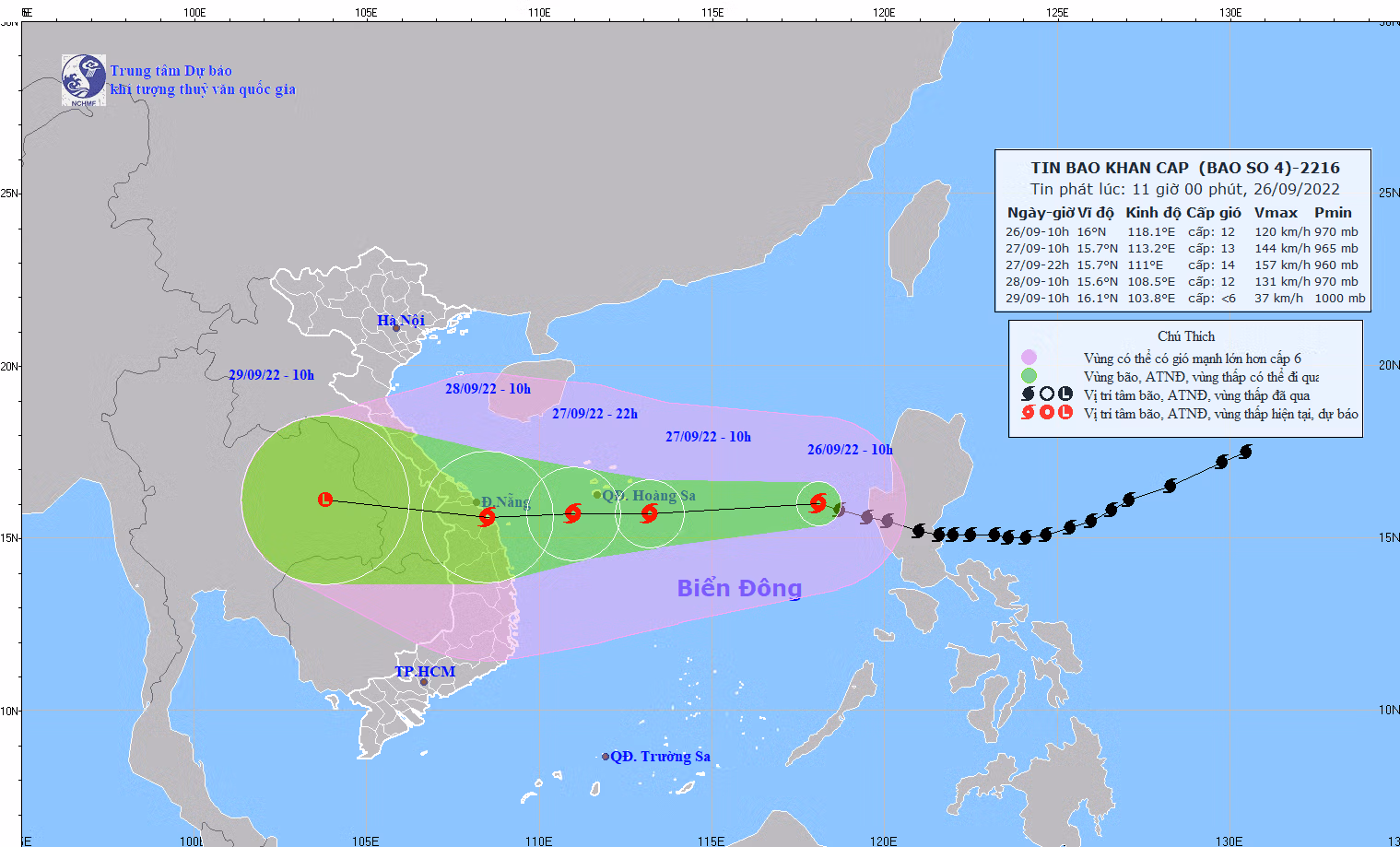 Theo Trung tâm Dự báo khí tượng thủy văn quốc gia, hồi 10h ngày 26/9, vị trí tâm bão ở khoảng 16 độ Vĩ Bắc; 118,1 độ Kinh Đông, trên vùng biển phía Đông khu vực Bắc và giữa Biển Đông, cách quần đảo Hoàng Sa khoảng 650 km về phía Đông. Sức gió mạnh nhất vùng gần tâm bão mạnh cấp 12 (118 - 133 km/giờ), giật cấp 14. Bán kính gió mạnh từ cấp 6, giật từ cấp 8 trở lên khoảng 210 km tính từ tâm bão; bán kính gió mạnh từ cấp 10, giật từ cấp 12 trở lên khoảng 100 km tính từ tâm bão.