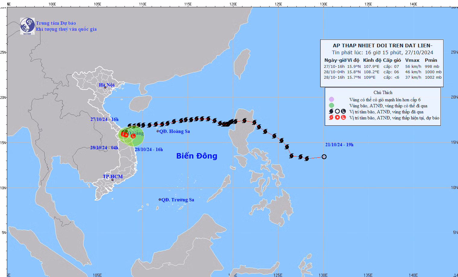 Hồi 16 giờ, vị trí tâm áp thấp nhiệt đới ở vào khoảng 15,9 độ Vĩ Bắc; 107,9 độ Kinh Đông, trên đất liền các tỉnh Thừa Thiên Huế, Quảng Nam-Đà Nẵng. Sức gió mạnh nhất vùng gần tâm áp thấp nhiệt đới mạnh cấp 7 (50-61km/h), giật cấp 9. Di chuyển theo hướng Nam Tây Nam, tốc độ khoảng 5km/h.