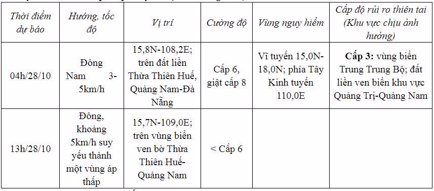 Mưa lớn: Từ nay đến hết đêm 28/10, ở khu vực từ Nam Hà Tĩnh đến Thừa Thiên Huế có mưa to đến rất to với lượng mưa từ 150-250mm, cục bộ có nơi trên 400mm; cảnh báo nguy cơ có mưa cục bộ cường suất lớn (>100mm/3h). Khu vực từ Đà Nẵng đến Quảng Ngãi và Kon Tum có mưa to, cục bộ có nơi mưa rất to với lượng mưa từ 70-150mm, cục bộ có nơi trên 200mm