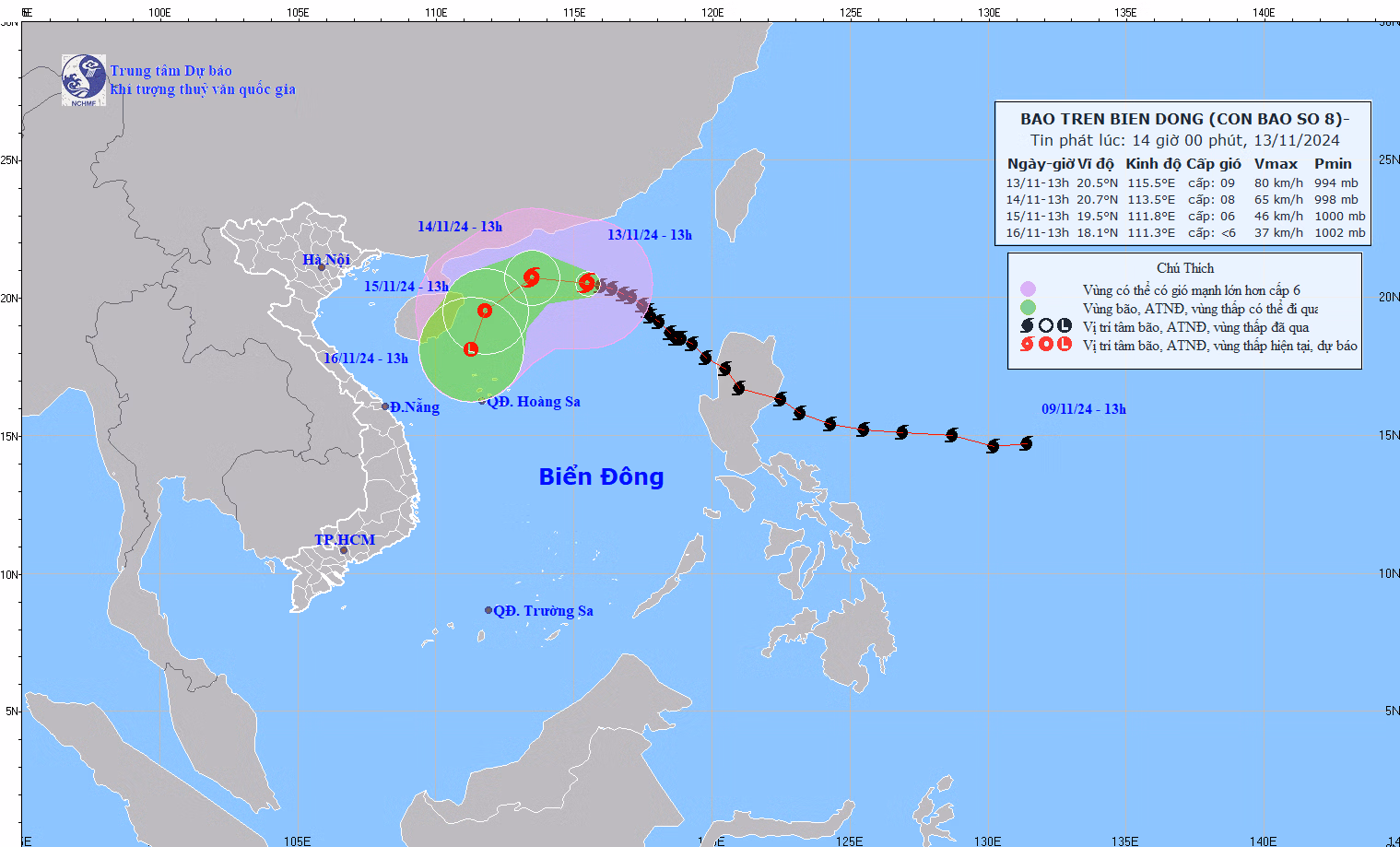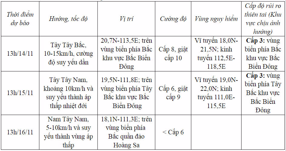 Theo Trung tâm khí tượng thủy văn Quốc gia, hồi 13 giờ ngày 13/11, vị trí tâm bão ở vào khoảng 20,5 độ Vĩ Bắc; 115,5 độ Kinh Đông, trên vùng biển phía Đông Bắc của khu vực Bắc Biển Đông. Sức gió mạnh nhất vùng gần tâm bão mạnh cấp 8-9 (62-88km/h), giật cấp 11. Di chuyển theo hướng Tây Tây Bắc, tốc độ 10-15km/h.