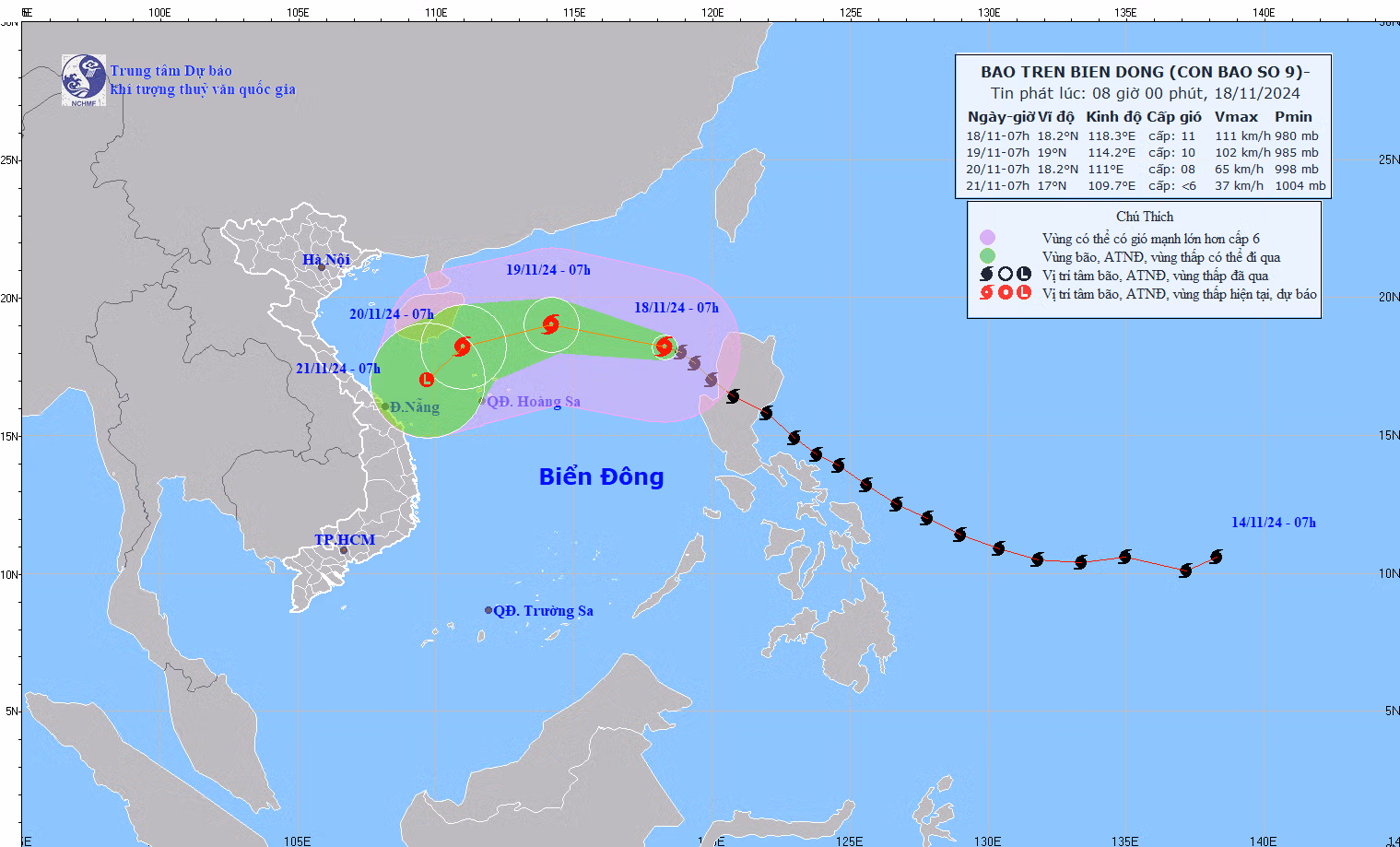 Theo Trung tâm dự báo khí tượng thủy văn Quốc gia, hồi 7 giờ ngày 18/11, vị trí tâm bão ở vào khoảng 18,2 độ Vĩ Bắc; 118,3 độ Kinh Đông, trên vùng biển phía Đông của khu vực Bắc Biển Đông. Sức gió mạnh nhất vùng gần tâm bão mạnh cấp 11 (103-117km/h), giật cấp 14. Di chuyển theo hướng Tây Tây Bắc, tốc độ khoảng 20km/h.