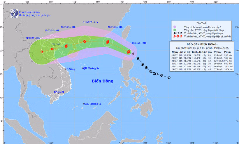 Theo Trung tâm Dự báo Khí tượng Thủy văn Quốc gia, hồi 1h ngày 19/7, vị trí tâm bão Wipha ở trên vùng biển phía Bắc đảo Luzon (Philippines).