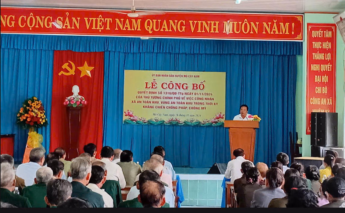 Theo Quyết định số 1316/QĐ-TTg ngày 01/11/2024 vừa được Thủ tướng ban hành về việc công nhận xã an toàn khu, vùng an toàn khu trong thời kỳ kháng chiến chống Pháp và chống Mỹ, trên địa bàn huyện Mỏ Cày Nam (Bến Tre) có 7 xã được công nhận xã ATK, gồm Định Thủy, Phước Hiệp, Bình Khánh, Minh Đức, An Thới, Tân Trung, Hương Mỹ và huyện Mỏ Cày Nam là vùng an toàn khu.