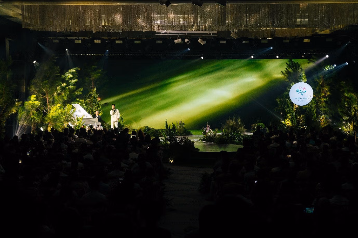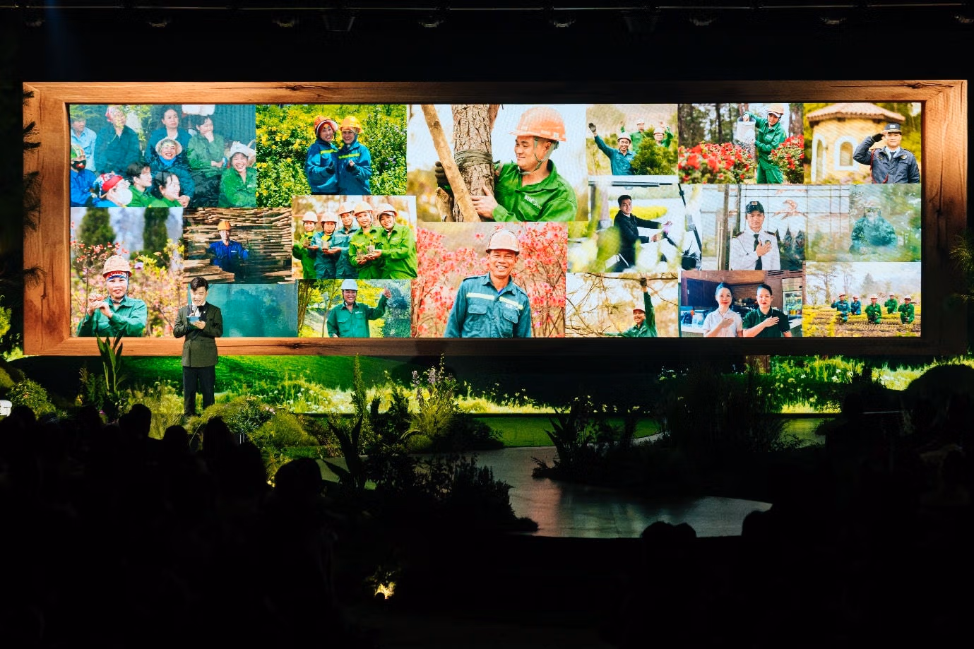 Ngay từ khoảnh khắc đặt chân vào sảnh tiếp đón, người tham dự đã như bước qua cánh cổng dẫn vào Thanh Xuan Valley. Không gian mở ra với hàng thông xanh vươn mình trong ánh sáng, thảm cỏ mềm mại dưới chân, những khóm hoa rực rỡ đúng mùa. Từng chi tiết được chăm chút tinh tế, như thể hơi thở của thung lũng vừa được mang tới.