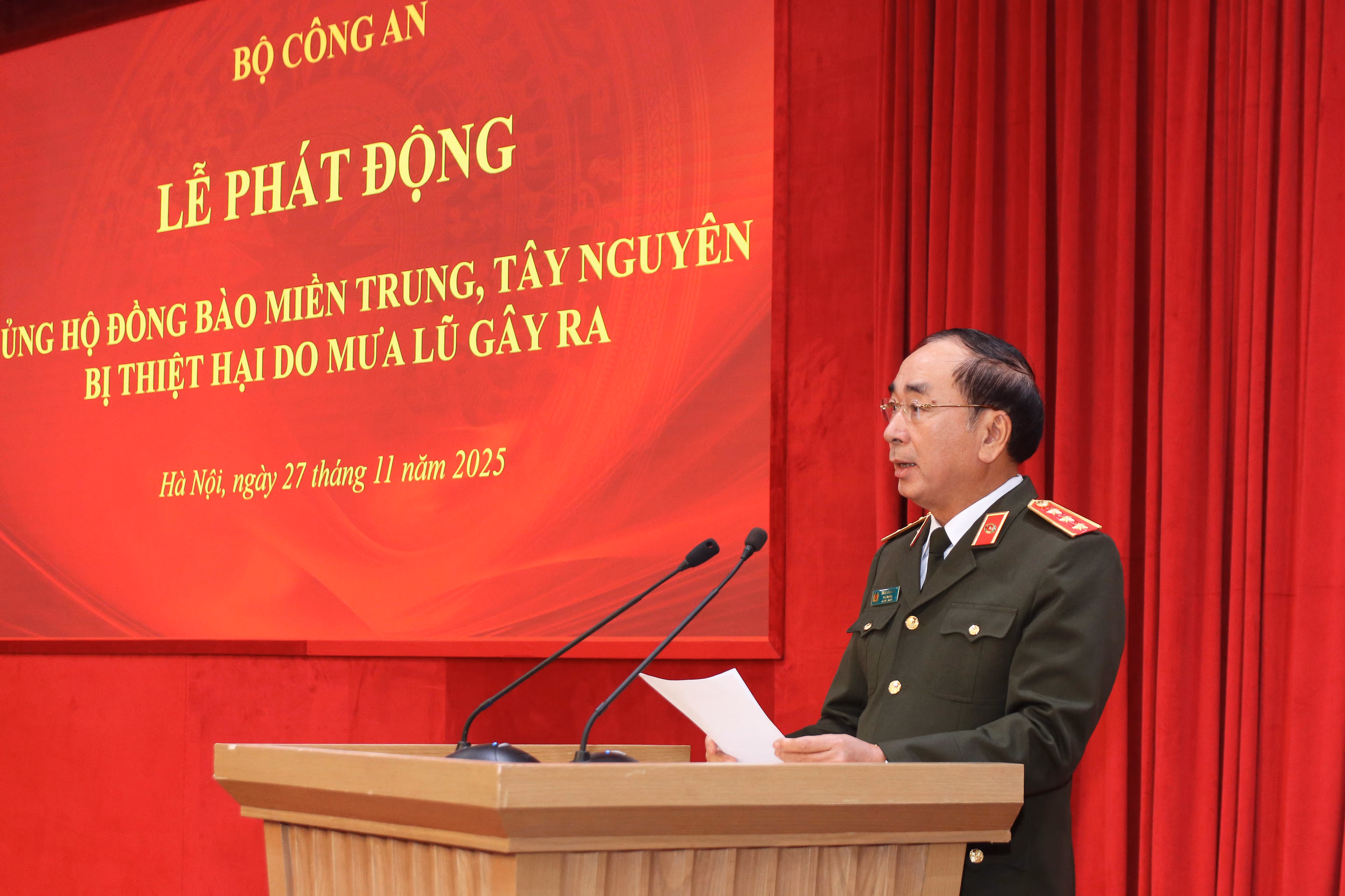 Sáng 27/11, tại Hà Nội, Bộ Công an tổ chức Lễ phát động ủng hộ đồng bào miền Trung, Tây Nguyên bị thiệt hại do mưa lũ gây ra. Thượng tướng Trần Quốc Tỏ, Ủy viên Trung ương Đảng, Phó Bí thư Đảng ủy Công an Trung ương, Thứ trưởng Bộ Công an chủ trì buổi lễ.