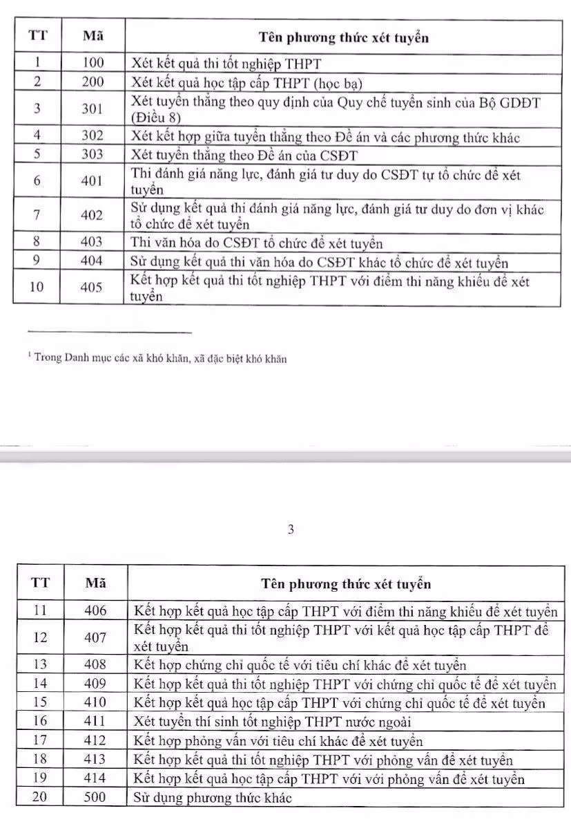Đối với các phương thức xét tuyển khác, mã tổ hợp gồm 3 ký tự do cơ sở đào tạo tự quy định.