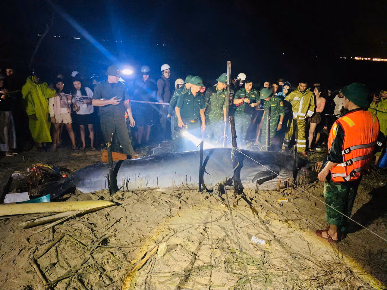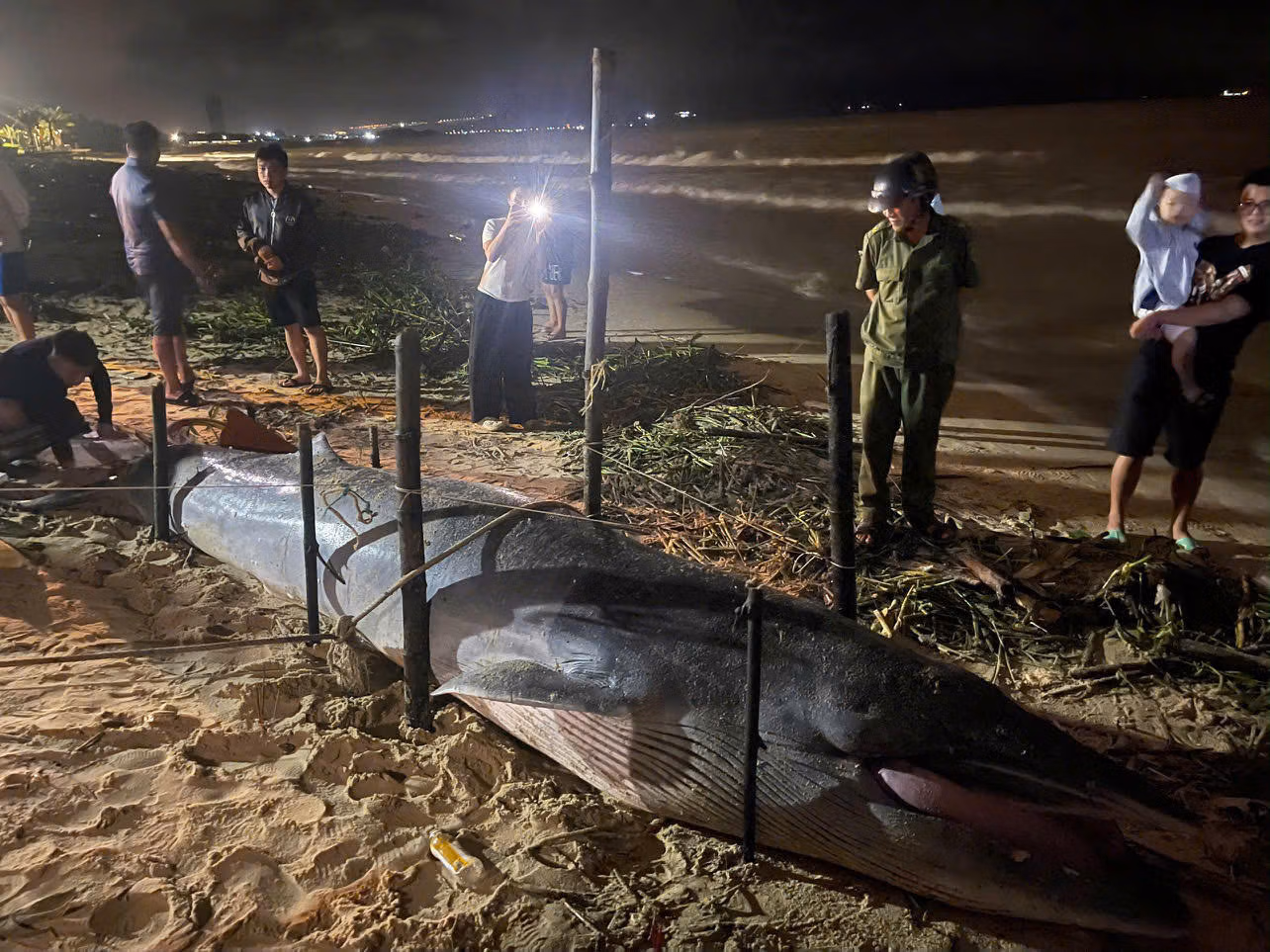Cá voi dài khoảng 4m, được người dân và lực lượng địa phương bảo vệ, căng dây giữ hiện trường và thắp hương theo phong tục truyền thống của người làng chài.