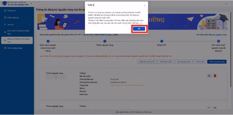 Nhấn vào nút OK để vào màn hình Thông tin đăng ký nguyện vọng của thí sinh
