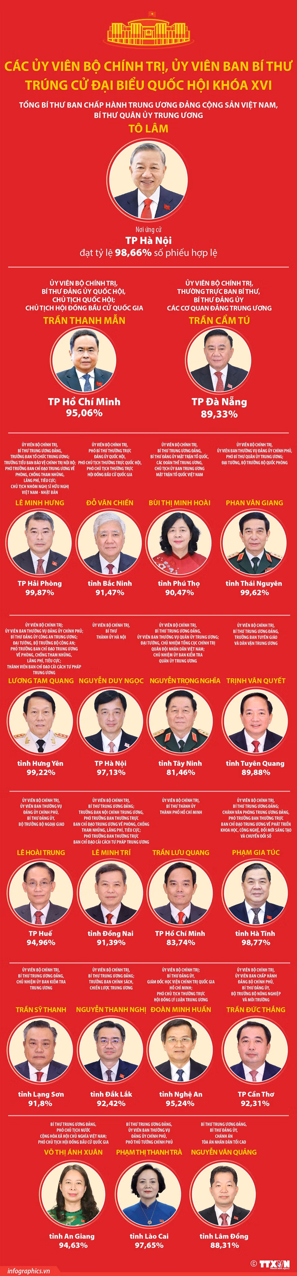Các Ủy viên Bộ Chính trị, Ủy viên Ban Bí thư trúng cử đại biểu Quốc hội khóa XVI Thứ Bảy 21/03/2026 21:14 (GMT+7) Đại đoàn kết xin trân trọng giới thiệu Danh sách các đồng chí Ủy viên Bộ Chính trị, Ủy viên Ban Bí thư trúng cử đại biểu Quốc hội khóa XVI. TheoVietnam+ (VietnamPlus)