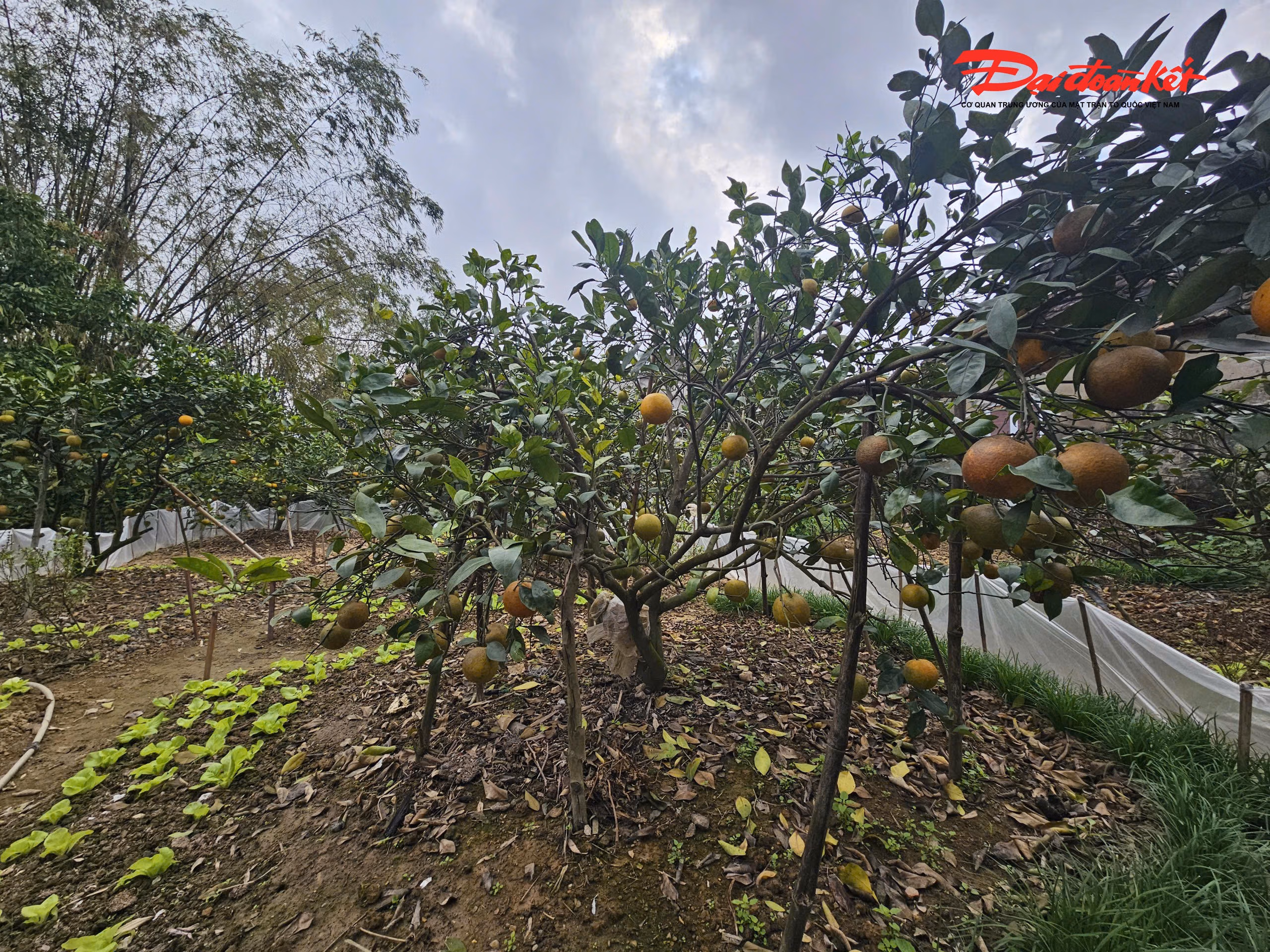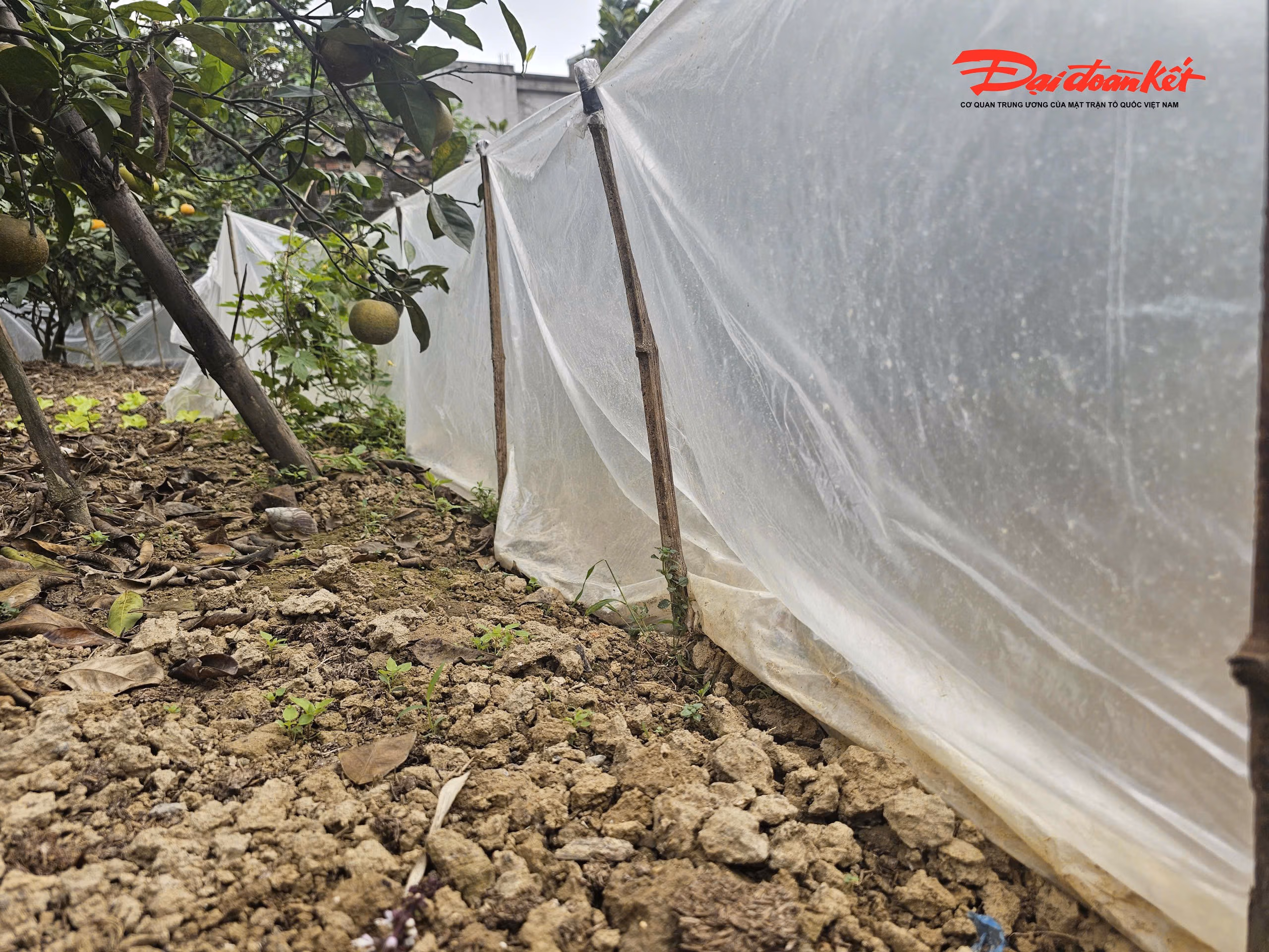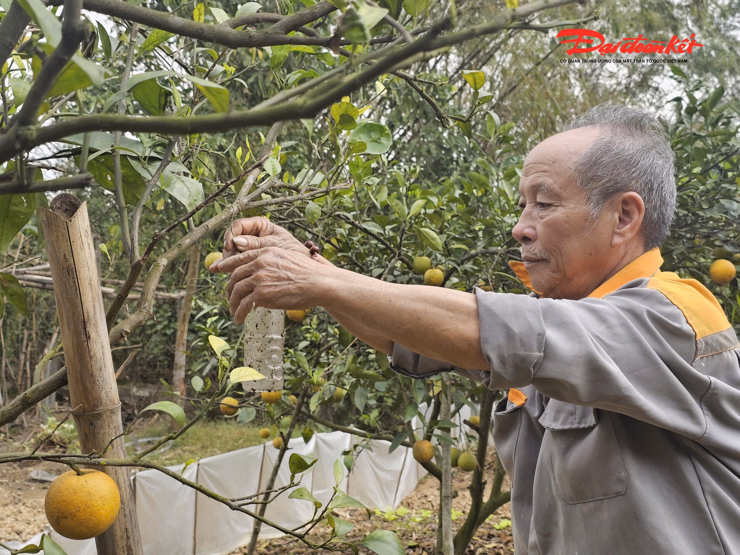 Với người trồng cam Xã Đoài, mỗi quả cam những ngày cận Tết đều quý giá chẳng khác nào vàng. Đếm quả để tính tiền, tính uy tín nên việc bảo vệ cam được thực hiện hết sức nghiêm ngặt. Quanh gốc cam, bà con giăng ni lông quây kín nhằm ngăn chuột và các loài gặm nhấm đào hang, cắn phá rễ. Trên từng cành cây, những túi chế phẩm sinh học được treo xen kẽ để xua đuổi côn trùng, hạn chế ruồi, bướm gây hại. Một số cây cam sai quả còn được “mắc màn”, phủ lưới mỏng từ gốc lên tận tán để ngăn chặn tối đa sâu bệnh tấn công.