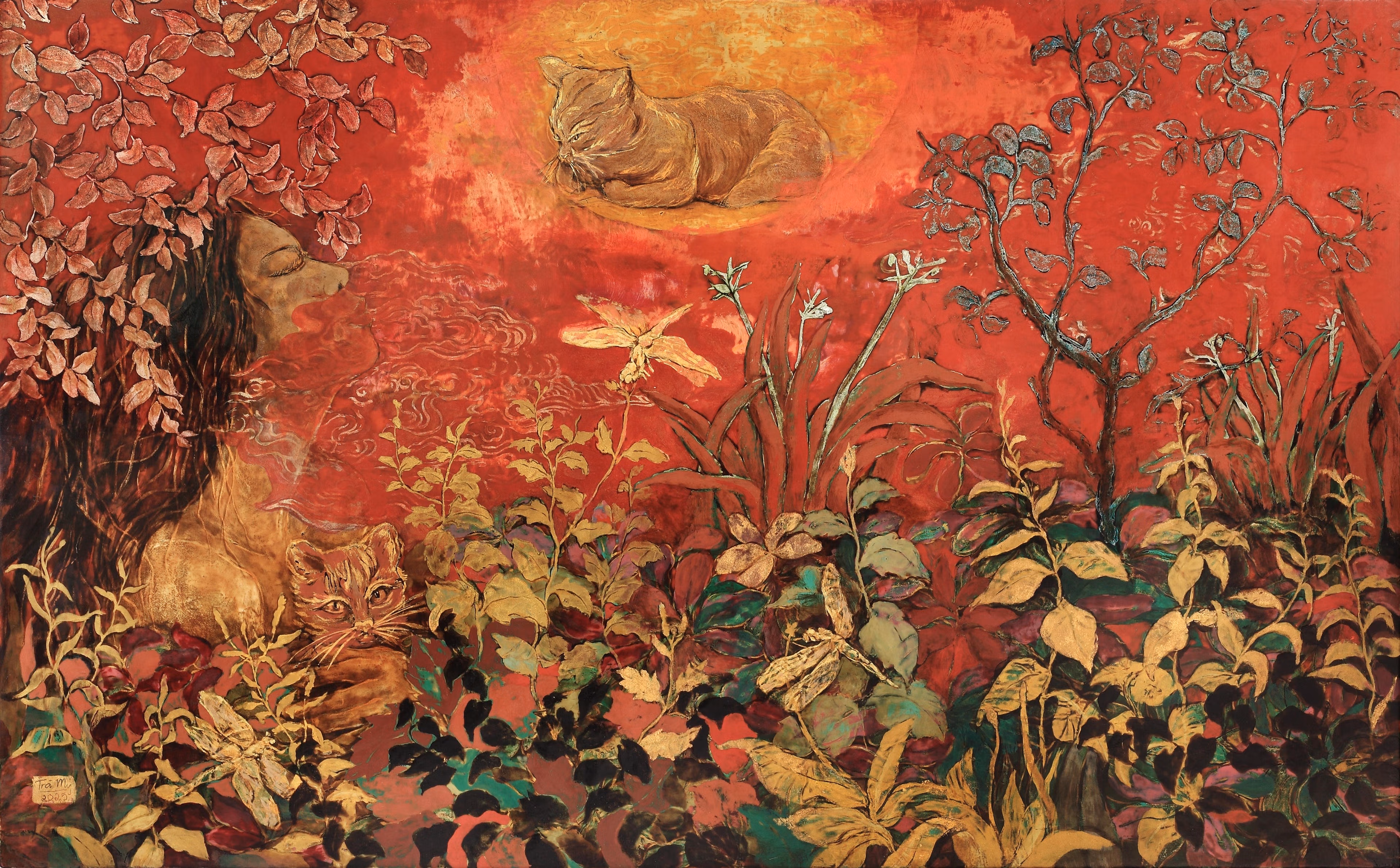Khu vườn nhiệt đới của Phạm Trà My vừa thực vừa mơ. Ở đó, những đường cong mềm mại của nước và mây, nhành hoa, ngọn cỏ, cánh chim, muông thú hay đàn cá nhỏ được cách điệu hóa, cùng những gương mặt người ẩn hiện, tạo nên một vẻ đẹp nữ tính, dịu dàng, không kém phần “nóng bỏng”. Tất cả tạo nên một vũ trụ nhiệt đới đầy mời gọi.