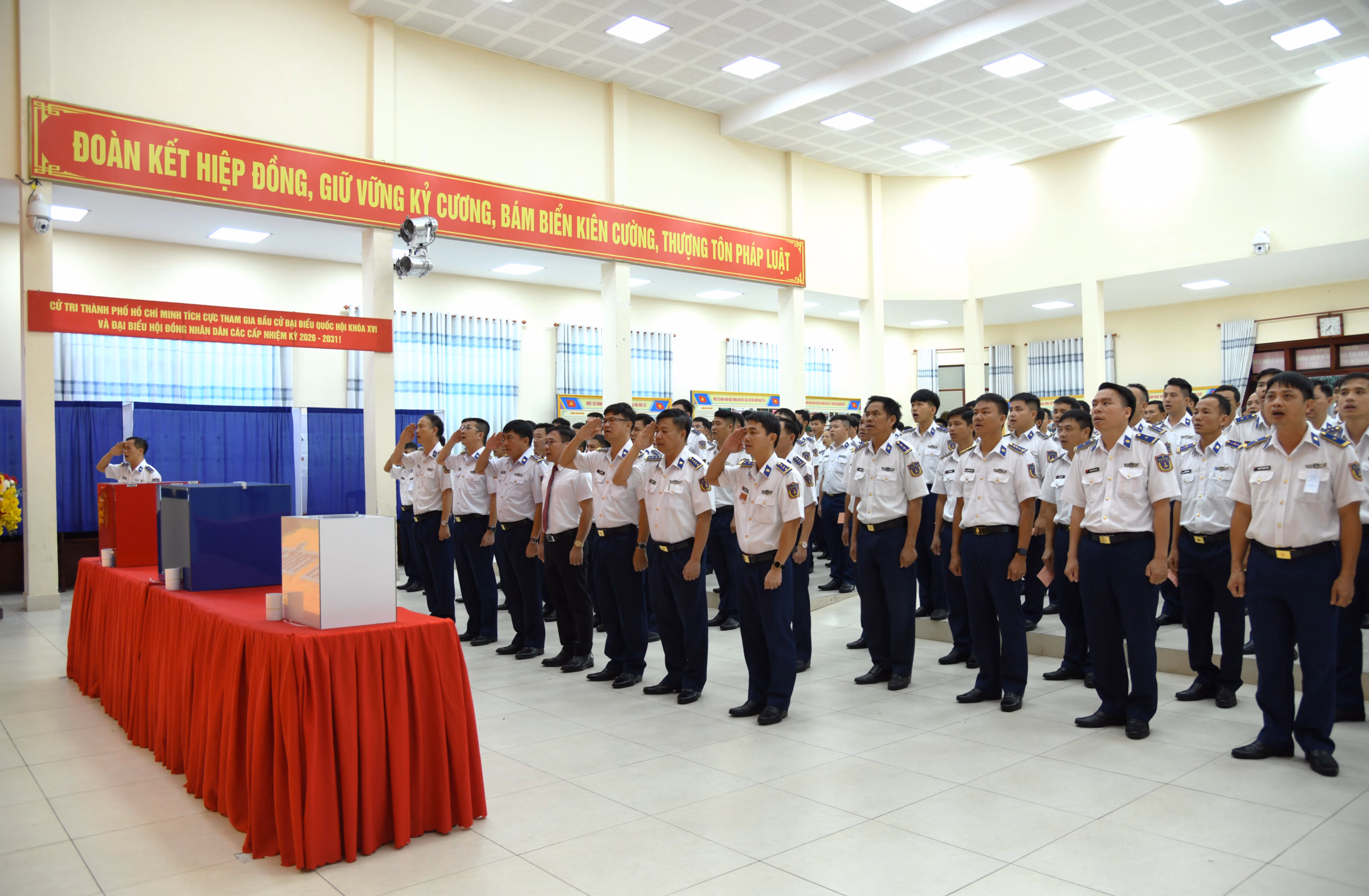 Hòa chung không khí Ngày hội bầu cử của cử tri cả nước, sáng 15/3 tại khu vực bỏ phiếu số 32 (phường Phước Thắng, TP Hồ Chí Minh), cử tri là cán bộ, chiến sĩ Bộ Tư lệnh Vùng Cảnh sát biển 3 và Đoàn đặc nhiệm Phòng chống tội phạm Ma túy số 3 đã tham gia lễ khai mạc bầu cử đại biểu Quốc hội (ĐBQH) khóa XVI và đại biểu Hội đồng nhân dân (HĐND) các cấp nhiệm kỳ 2026 - 2031.