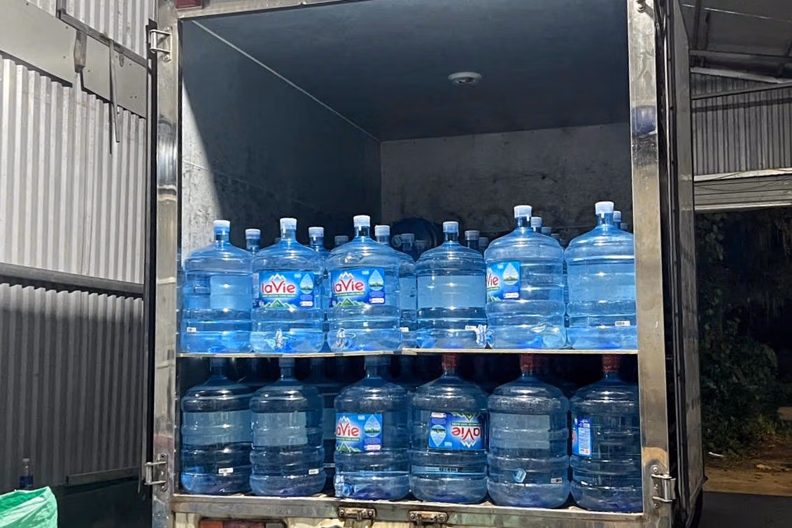 Công an Hà Nội thông tin, kiểm tra xưởng sản xuất nước của đối tượng Lê Văn Viết (sinh năm 1988; trú tại phường Long Biên, TP Hà Nội), đã phát hiện các đối tượng đang dùng vòi bơm nước máy rồi đóng vào các bình Lavie với giá 70.000 đồng/bình.