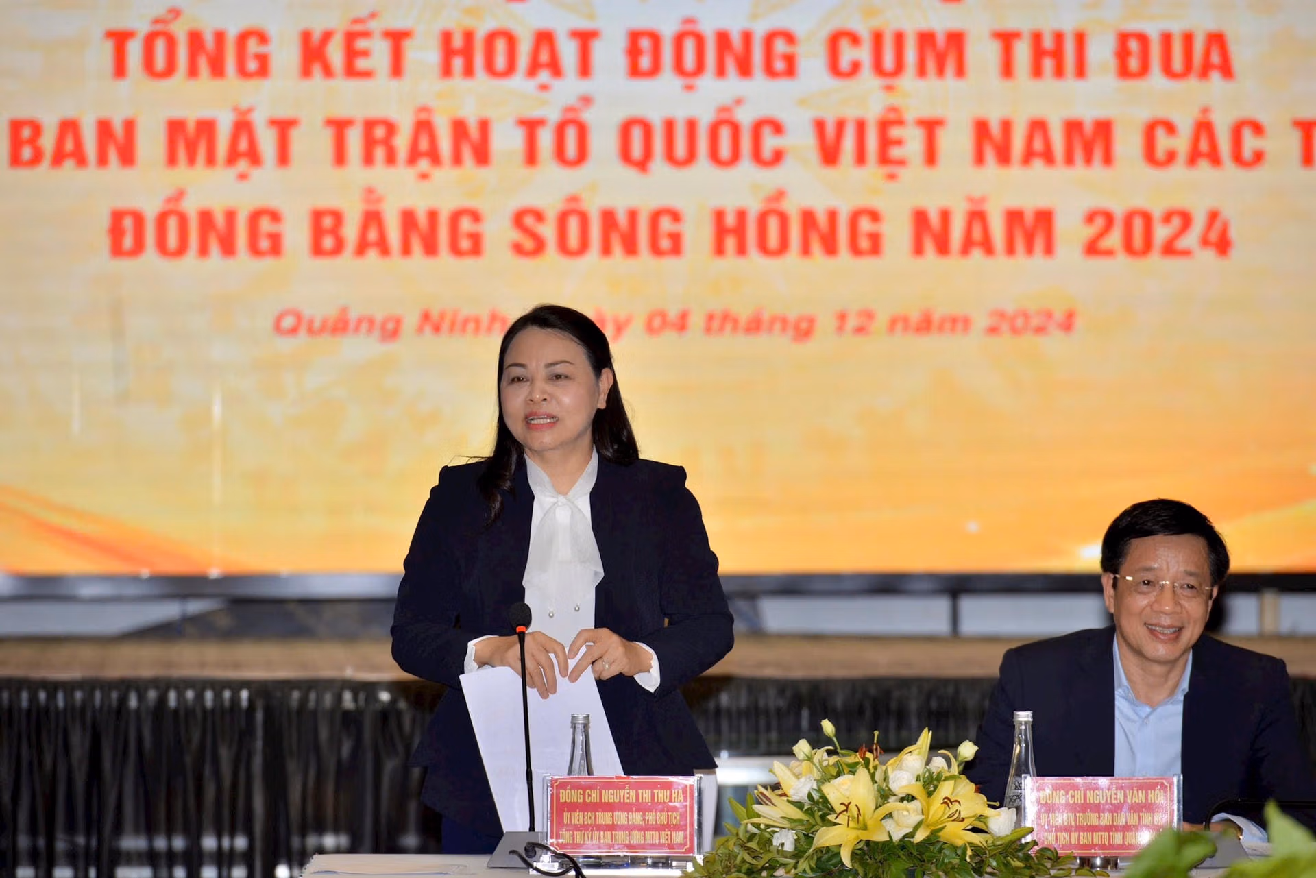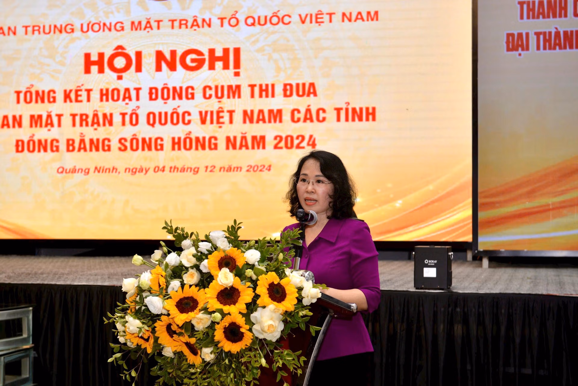 Phát biểu chỉ đạo tại Hội nghị, Phó Chủ tịch - Tổng Thư ký UBTƯ MTTQ Việt Nam Nguyễn Thị Thu Hà nhấn mạnh, năm 2024, công tác Mặt trận nói chung, công tác Mặt trận 9 tỉnh trong Cụm thi đua nói riêng đã hoàn thành xuất sắc các nhiệm vụ trọng tâm theo kế hoạch và các nhiệm vụ đột xuất, phát sinh trên cơ sở rõ việc, rõ vai trò, rõ tiến độ, rõ trách nhiệm.