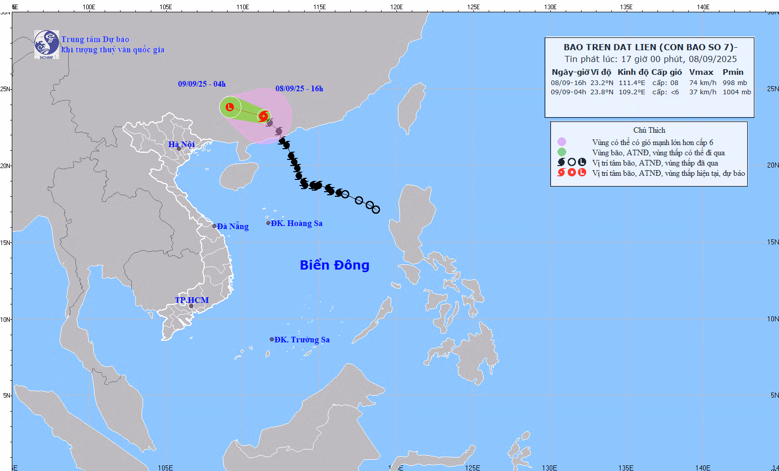 Theo Trung tâm Dự báo Khí tượng Thủy văn Quốc gia: Hồi 16 giờ ngày 8/9, vị trí tâm bão ở trên đất liền phía Tây Nam tỉnh Quảng Đông (Trung Quốc). Sức gió mạnh nhất vùng gần tâm bão mạnh cấp 8 (62-74km/giờ), giật cấp 10. Di chuyển theo hướng Tây Bắc, tốc độ 20-25km/giờ.