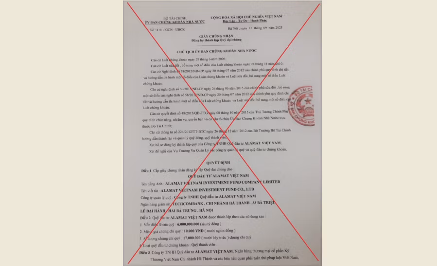 Ủy ban Chứng khoán Nhà nước (SSC) khẳng định văn bản đề Số 416/GCN-UBCK ngày 15/9/2023 là giả mạo; SSC không cấp giấy chứng nhận đăng ký lập quỹ đại chúng cho Quỹ Đầu tư Almat Việt Nam.