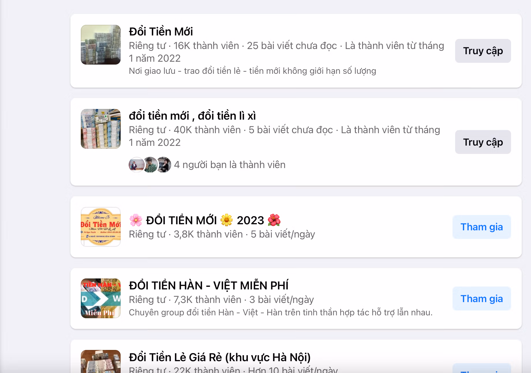 Theo đó, chỉ cần gõ từ khóa “đổi tiền lì xì tết” trên mạng xã hội là hàng trăm bài đăng, hội nhóm hiện ra với những lời mời gọi, cam kết “tiền thật”, “tiền mới”, “giá rẻ nhất thị trường”,... Thậm chí, nhiều chủ tài khoản còn nhận “đổ buôn” tiền lẻ, tiền mới cho ai có nhu cầu hay tuyển cộng tác viên đăng bài.