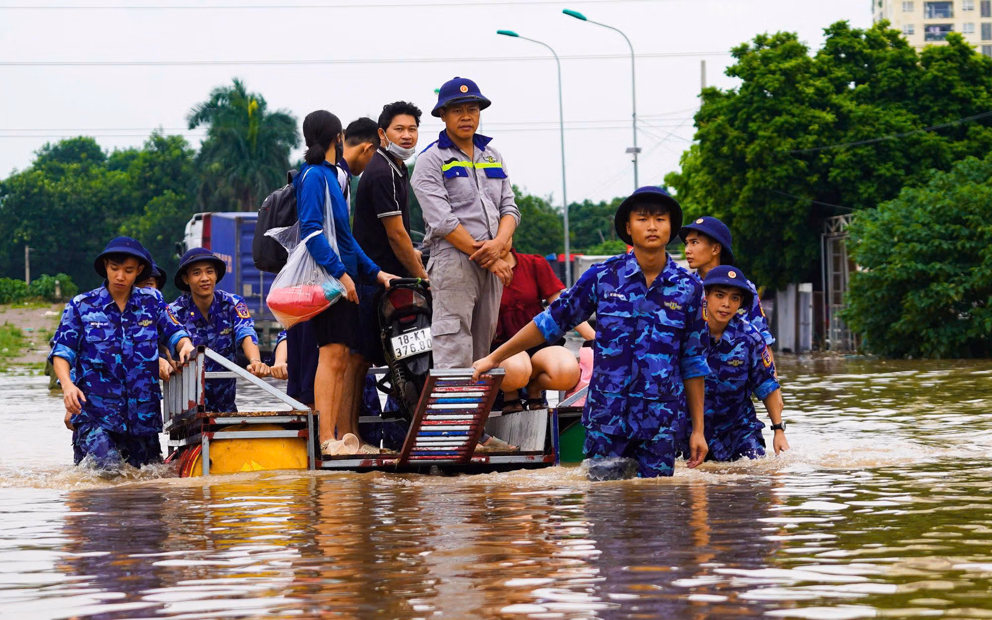 Cảnh sát biển dùng phà tự chế, hỗ trợ người dân Hà Nội di chuyển qua vùng ngập sâu