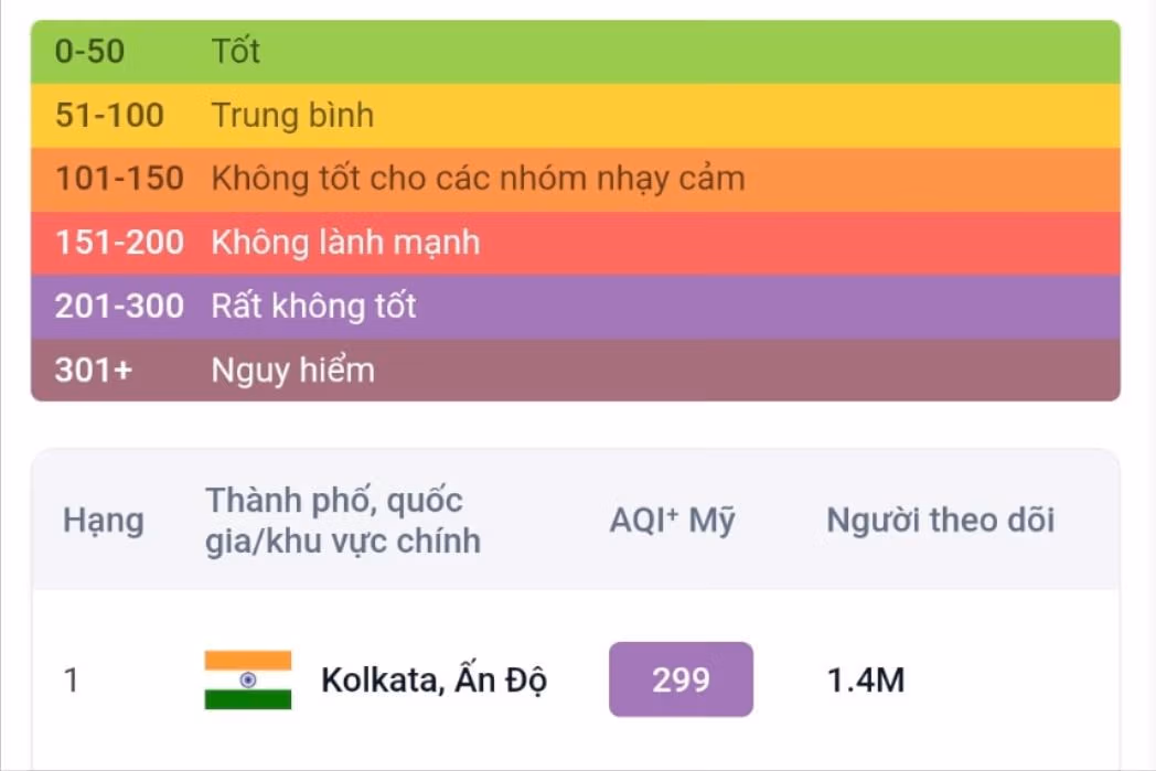 Cũng vào thời điểm này, thành phố có chất lượng không khí tốt nhất trong danh sách 123 địa điểm được IQAir theo dõi là Sydney, Australia ở mức 11. Địa phương có chất lượng không khí ở mức ô nhiễm nhất ghi nhận thời điểm này là Kolkata, Ấn Độ với mức cảnh báo tím 299 "rất không tốt".