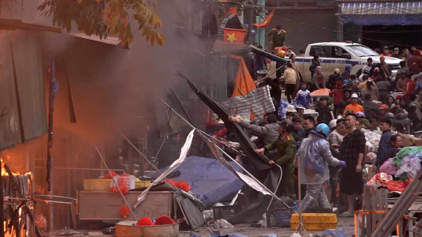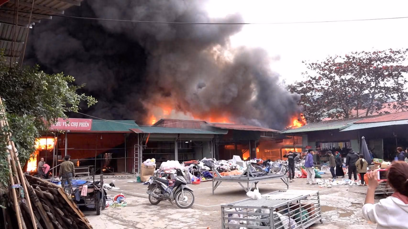 Theo thông tin ban đầu, ngọn lửa xuất phát từ một gian hàng quần áo trong chợ và nhanh chóng lan ra cả chợ. Dù các tiểu thương, người dân và cơ quan chức năng đã đã nỗ lực dập lửa, nhưng do ngoài trời có gió mạnh nên đám cháy nhanh chóng lan rộng.