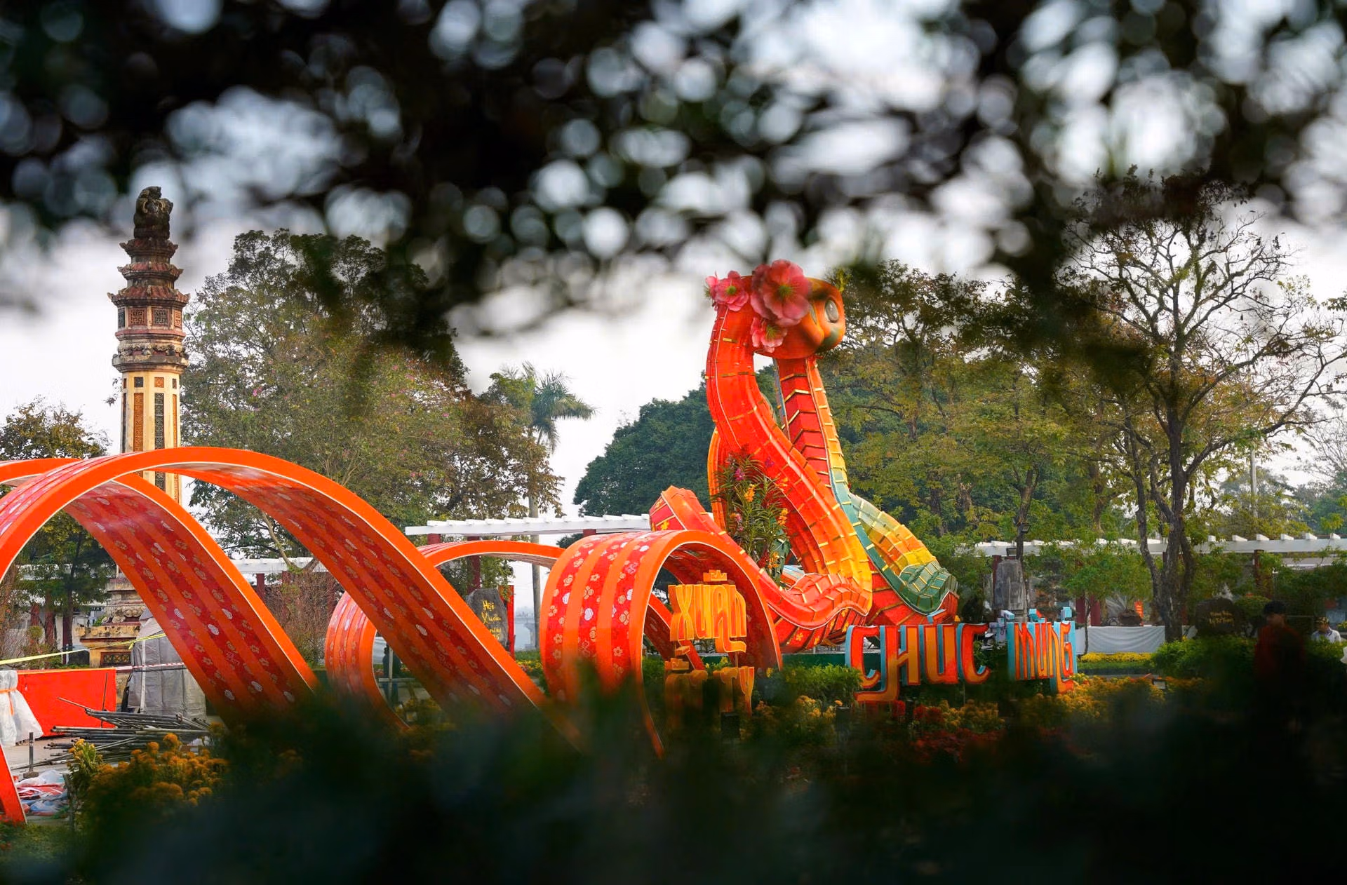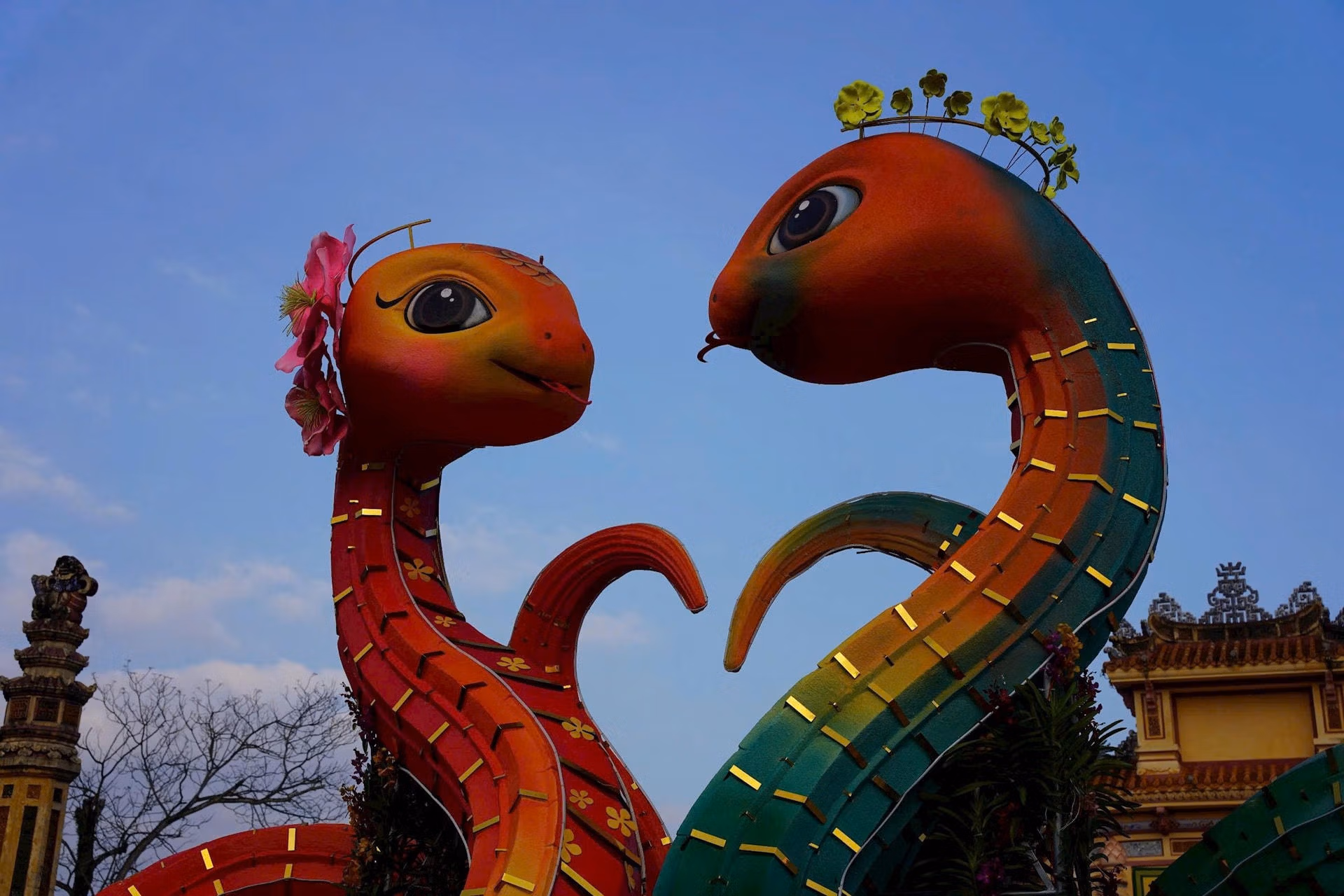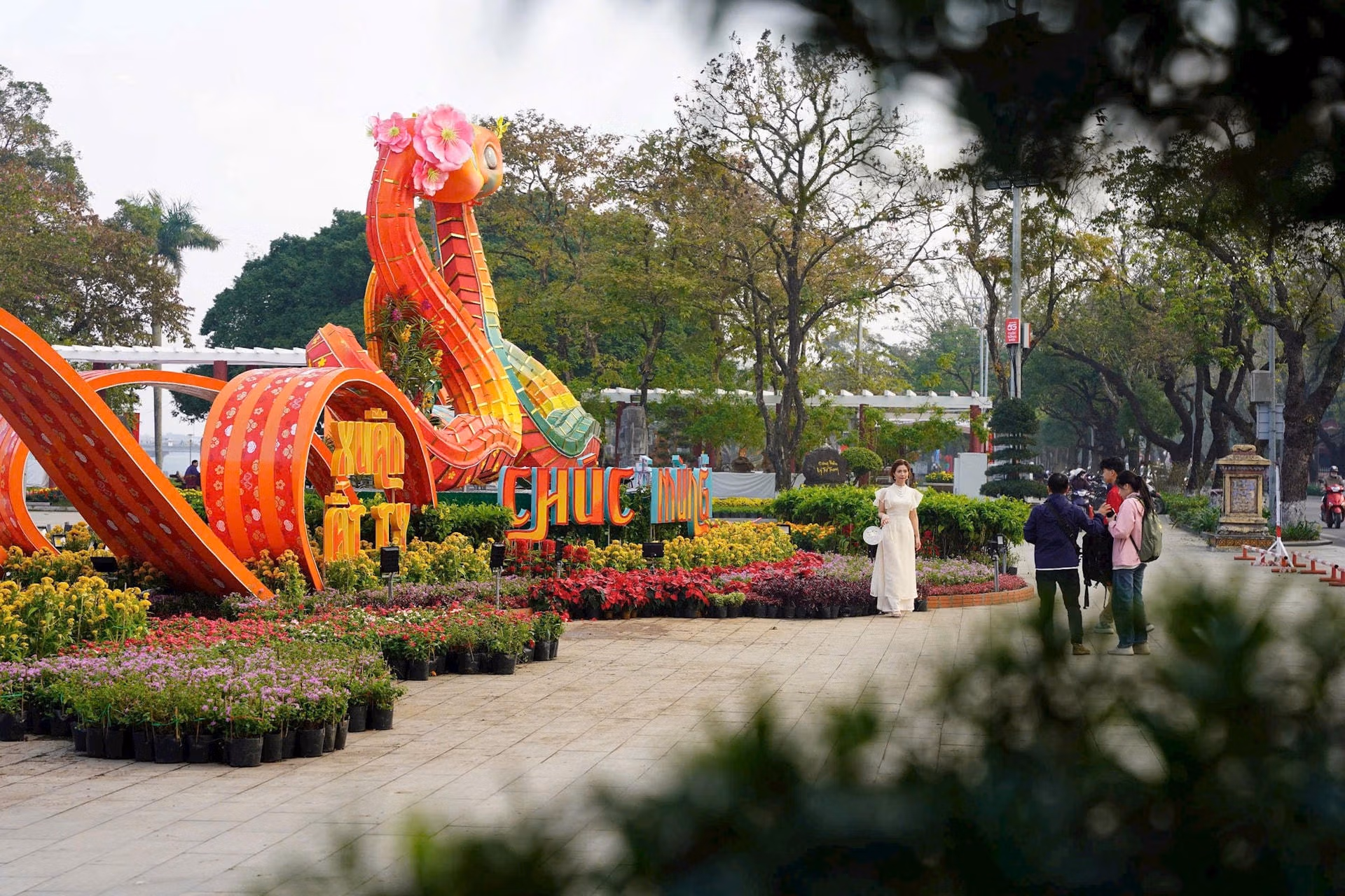 Chiêm ngưỡng linh vật rắn Tết Ất Tỵ ở Huế Chủ Nhật 26/01/2025 15:59 (GMT+7) Cặp linh vật rắn ở Huế sau khi được hoàn thiện đã thu hút nhiều người dân đến tham quan, chiêm ngưỡng và check in. Ngày 26/1, Trung tâm Công viên cây xanh quận Thuận Hóa (TP Huế) cho biết, sau thời gian chế tác, lắp đặt, cặp linh vật rắn đặt tại khu vực trước Trường THPT Chuyên Quốc học Huế đã hoàn thiện và đưa vào phục vụ khách tham quan trong dịp Tết Nguyên đán Ất Tỵ 2025. Ảnh: N.Q.Cặp linh vật rắn được thiết kế với hình dáng thon dài, uốn lượn và đầy màu sắc. Ảnh: N.Q.Ngoài ra, xung quanh đôi linh vật rắn được trang trí bằng nhiều hoa tươi tạo nên một khung cảnh vô cùng rực rỡ. Ảnh: N.Q.Ông Dương Quang Hiền, Giám đốc Trung tâm Công viên cây xanh quận Thuận Hóa cho biết, đôi linh vật rắn này được lấy ý tưởng từ hình ảnh rắn trên Cửu Đỉnh (Đại nội Huế) và được cách điệu nhằm tạo ra hình hài hiền hòa, vui tươi. Ảnh: N.Q.Cặp linh vật rắn này có chiều dài khoảng 30m, được làm bằng khung thép để đảm bảo cố định và chắc chắn. Ảnh: N.Q.Hoa tươi, tiểu cảnh và các họa tiết về năm mới Ất Tỵ 2025 được bố trí xung quanh đôi linh vật rắn. Ảnh: N.Q.Linh vật rắn có dáng vẻ vui tươi, sau khi trình làng được người dân và du khách vô cùng thích với tạo hình bắt mắt. Ảnh: N.Q.Sau khi hoàn thiện, linh vật rắn ở Huế thu hút rất đông người dân và du khách đến chiêm ngưỡng và checkin. Ảnh: N.Q.Linh vật rắn trở thành điểm nhấn của Huế trong dịp Tết Nguyên đán Ất Tỵ 2025. Ảnh: N.Q. Nguyễn Quốc