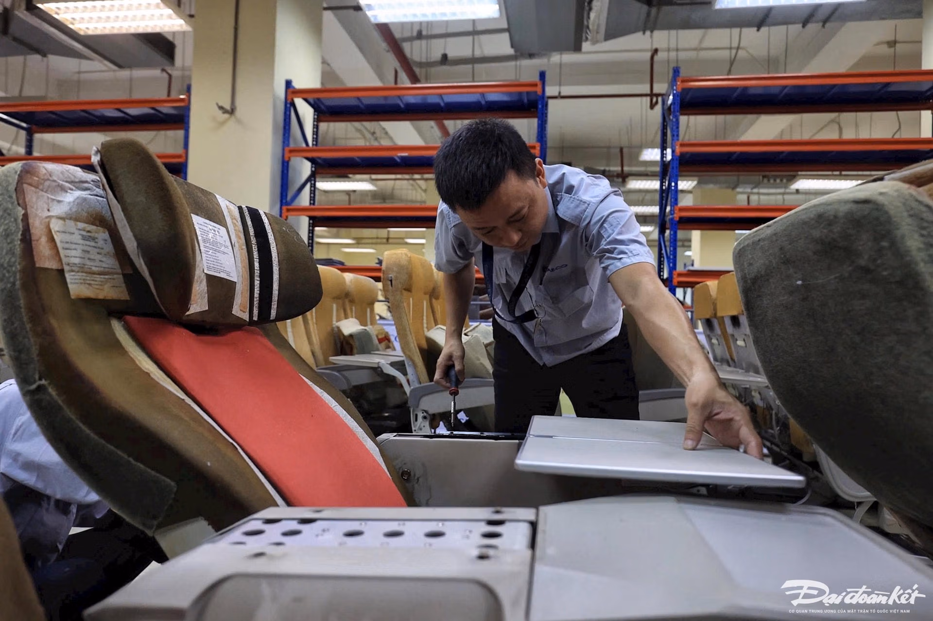 Chiêm ngưỡng xưởng sửa chữa máy bay tại Nội Bài Thứ Ba 10/06/2025 12:08 (GMT+7) Nhằm đảm bảo an toàn trước khi máy bay cất cánh, các đội ngũ kỹ sư, kỹ thuật viên Công ty TNHH MTV Kỹ thuật máy bay kiểm tra, bảo dưỡng kỹ lưỡng từng bộ phận. Theo ghi nhận của Báo Đại Đoàn Kết tại Cảng Hàng không Quốc tế Nội Bài, Công ty TNHH MTV Kỹ thuật máy bay đang vận hành và khai thác 2 xưởng sửa chữa máy bay. Xưởng sửa chữa số 1 chứa được 1 máy bay thân hẹp; xưởng sửa chữa số 2 rộng 12.000m2 có thể chứa 4 máy bay thân hẹp hoặc 2 máy bay thân rộng cùng một thời điểm.Xưởng sửa chữa số 1 chứa được 1 máy bay thân hẹp; xưởng sửa chữa số 2 rộng 12.000m2 có thể chứa 4 máy bay thân hẹp hoặc 2 máy bay thân rộng cùng một thời điểm.Tại khu vực xưởng sẽ thực hiện bảo dưỡng nội trường cho cả máy bay thân hẹp và thân rộng như A319, A320, A321, A330, A350, B777, B787, ATR và tuân thủ theo tiêu chuẩn CAAV, FAA, EASA, CAAP, SSCA...Để tháo, lắp một phần cánh tà trước của tàu bay A350 phải cần 6-8 người cùng cẩu trục phối hợp thực hiện theo đúng quy trình và đảm bảo độ chính xác tuyệt đối.Từng bộ phận, chi tiết của máy bay đều được kiểm tra tỉ mỉ.Thời gian bảo dưỡng, sửa chữa sẽ tùy theo tình trạng của từng máy bay.Tại buồng lái, anh Lương Minh Hiếu (Đội 5, Trung tâm bảo dưỡng nội trường) cho biết: "Dựa theo tài liệu, quy định của hãng sản xuất, chúng tôi sẽ kiểm tra các hệ thống thủy lực, bánh lái điều khiển... xem có hoạt động trơn tru và đáp ứng điều kiện để bay hay không. Nếu báo lỗi sẽ tiến hành sửa chữa hoặc thay thế".Nội thất của máy bay A321 được kiểm tra, sửa chữa, thay mới theo định kỳ.Đới với bảo dưỡng ngoại trường sẽ thực việc các phần việc quy mô nhỏ, thực hiện được ngoài trời.Việc sửa chữa, bảo dưỡng động cơ máy bay được các kỹ sư thực hiện kỹ lưỡng.Sau khi hoàn tất việc kiểm tra, bảo dưỡng đầy đủ các điều kiện an toàn máy bay mới bắt đầu được vận hành. Lê Khánh