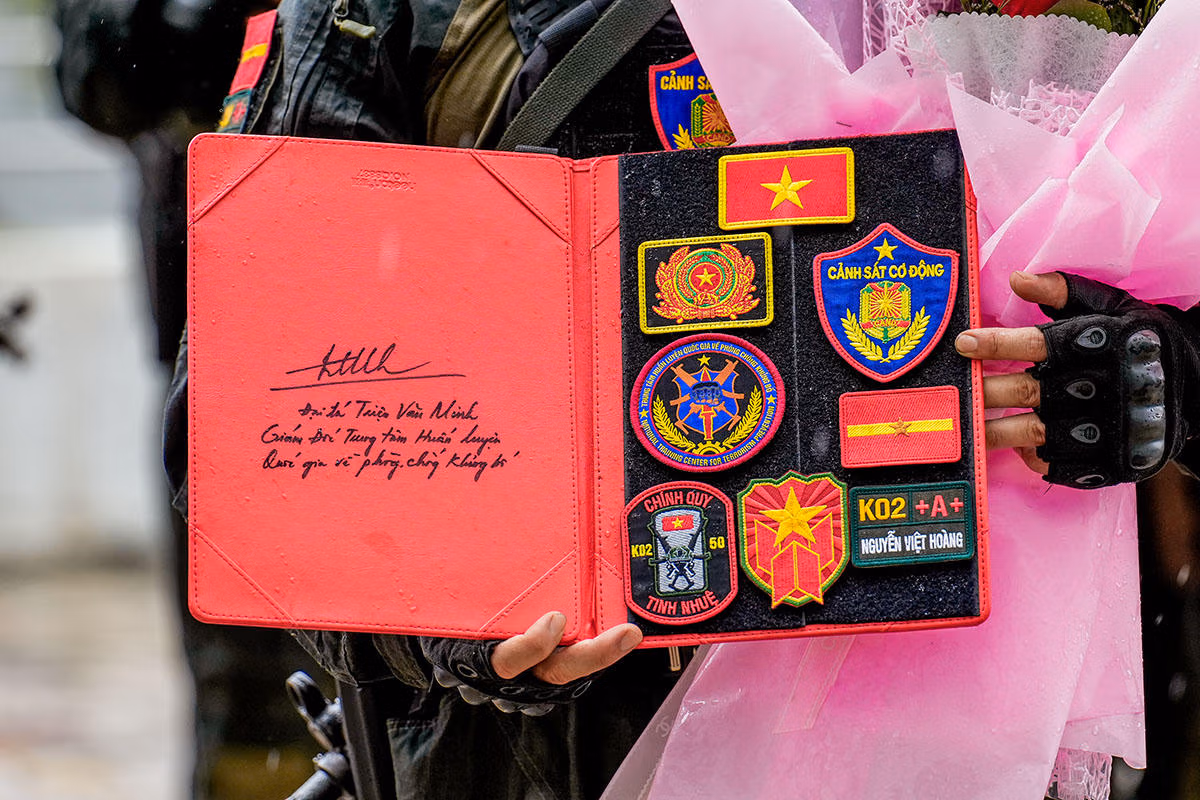 Đối với Song Luân, sự dũng cảm không chỉ giúp anh vượt qua giới hạn, mà còn truyền thêm năng lượng cho cả đội hình. Xuất sắc hoàn thành thử thách, anh vinh dự nhận huy hiệu hoa điểm mười từ chính tay Đại uý Nguyễn Đức Duân.