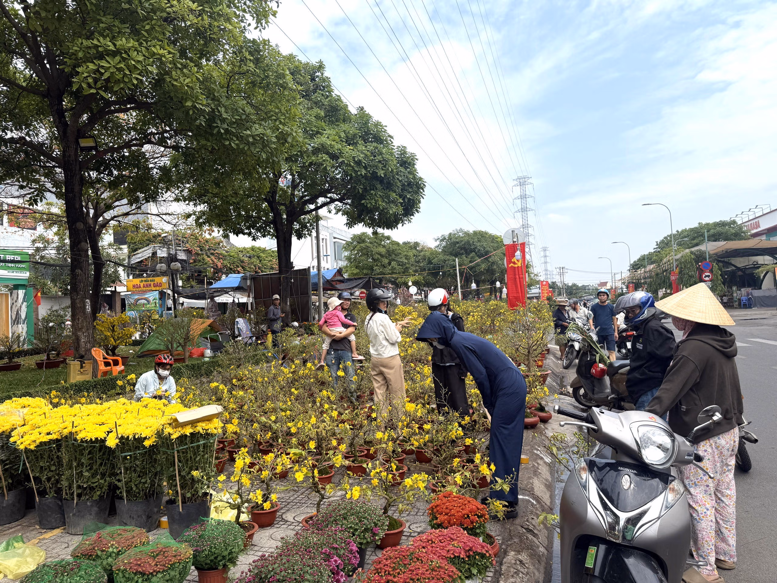 Tại chợ hoa phường Tăng Nhơn Phú, dòng người đổ về tham quan, mua sắm khá đông. Từ sớm, các gian hàng đã rực rỡ đủ sắc màu của mai vàng, cúc mâm xôi, vạn thọ, lan hồ điệp đến bonsai, kiểng lá trang trí. Không khí mua bán diễn ra khẩn trương nhưng vẫn giữ được nét thong thả đặc trưng của những phiên chợ cuối năm.