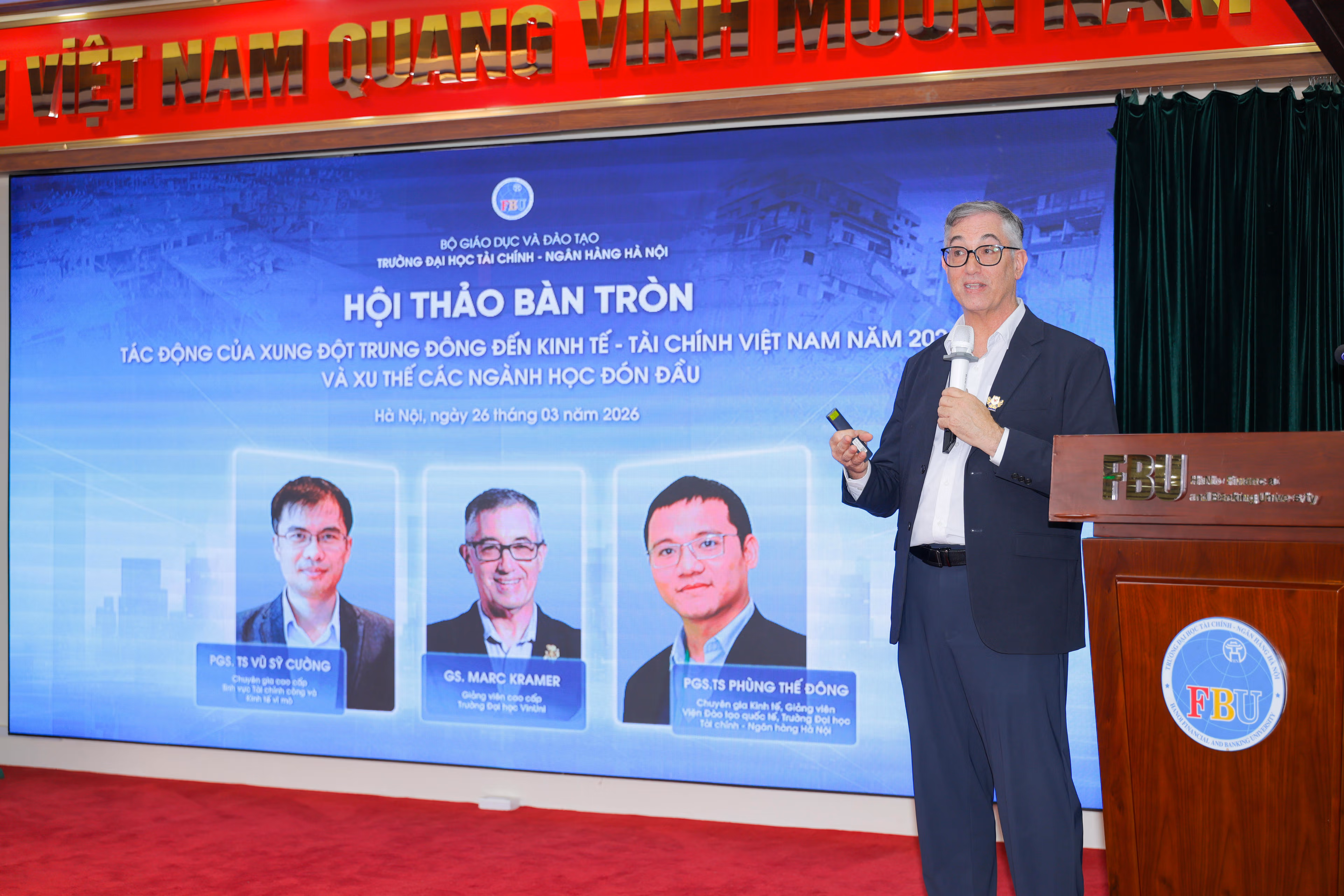 Sáng 26/3/2026, tại Hà Nội, Trường Đại học Tài chính – Ngân hàng Hà Nội (FBU) tổ chức Hội thảo bàn tròn với chủ đề “Tác động của xung đột Trung Đông đến Kinh tế – Tài chính Việt Nam năm 2026 và xu thế các ngành học đón đầu”.