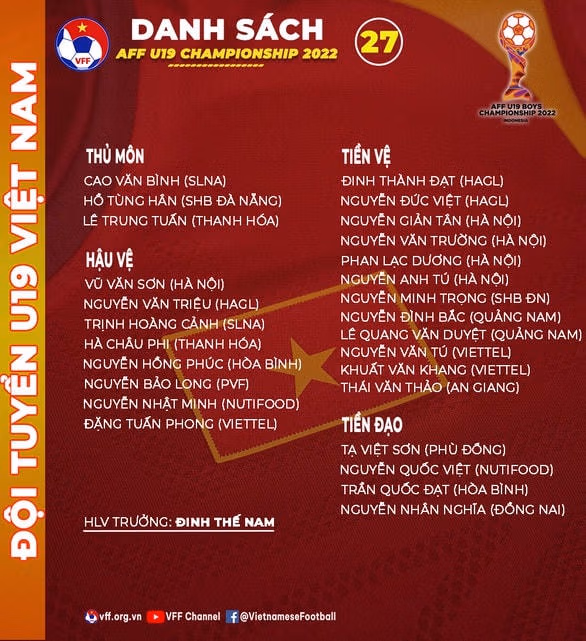 HLV Đinh Thế Nam vừa chốt danh sách 27 cầu thủ U19 Việt Nam tham dự giải U19 Đông Nam Á. Theo điều lệ của giải đấu, các đội sẽ được đăng ký danh sách rút gọn 25 cầu thủ cho giải đấu và 23 cầu thủ cho mỗi trận đấu. Những cầu thủ còn lại sẽ là phương án dự phòng nếu như thành viên trong đội mắc Covid-19.