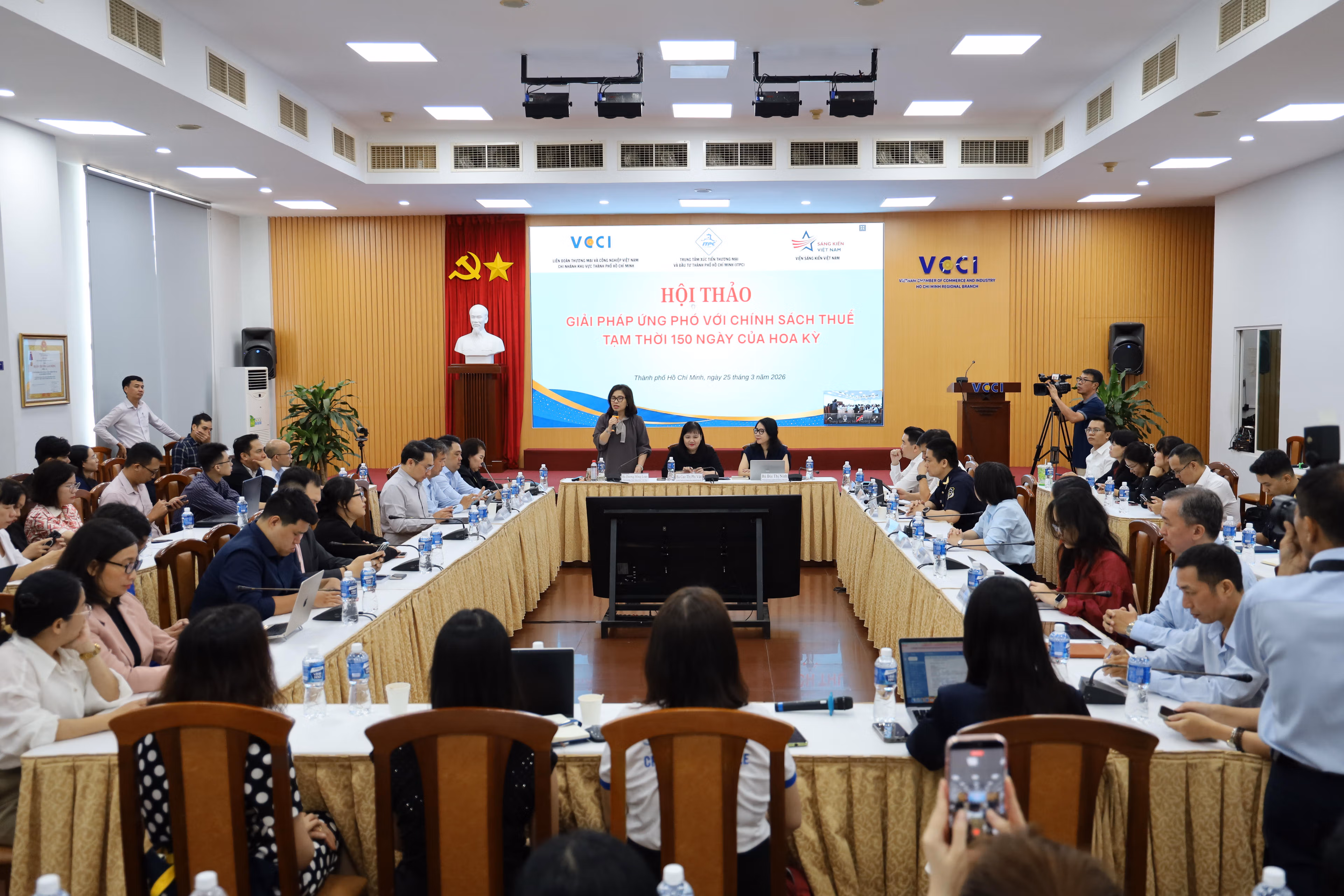 Ngày 25/3, Trung tâm Xúc tiến Thương mại và Đầu tư TP Hồ Chí Minh phối hợp Liên đoàn Thương mại và Công nghiệp Việt Nam và Viện Sáng kiến Việt Nam tổ chức hội thảo “Giải pháp ứng phó chính sách thuế tạm thời 150 ngày của Hoa Kỳ”. Hội thảo thu hút sự quan tâm của cộng đồng doanh nghiệp xuất khẩu, đặc biệt là các ngành hàng phụ thuộc lớn vào thị trường Mỹ.