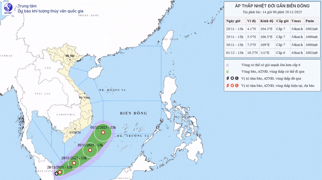 Hồi 13 giờ ngày 28/11, vị trí tâm ATNĐ khoảng 4,1 độ vĩ Bắc; 104,3 độ kinh Đông; sức gió mạnh nhất vùng gần tâm ATNĐ mạnh cấp 6-7, giật cấp 9; di chuyển theo hướng Đông Bắc, tốc độ khoảng 15km/h.
