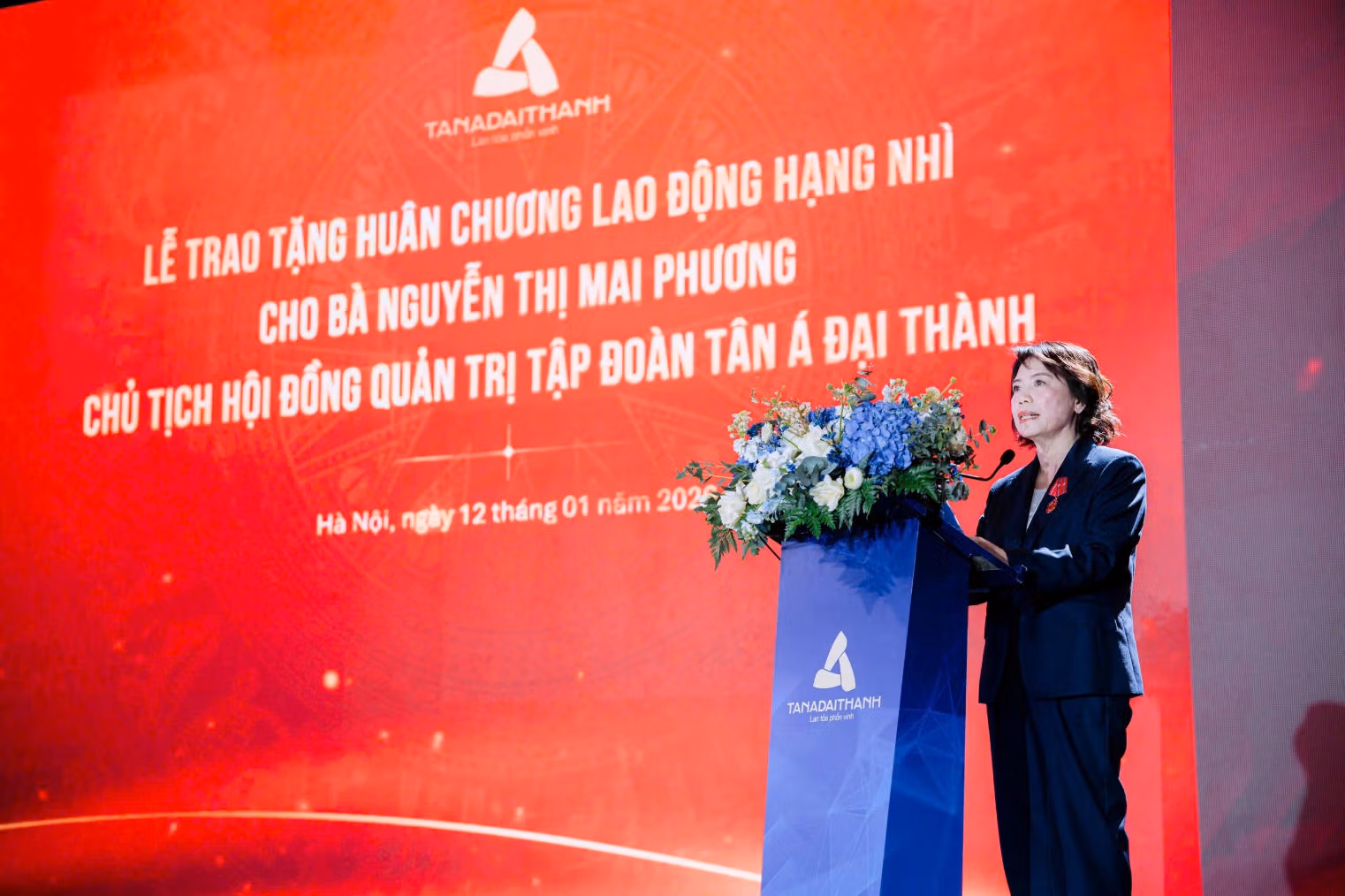 Ngày 12/01/2026, tại Hà Nội, bà Nguyễn Thị Mai Phương - Chủ tịch Hội đồng Quản trị Tập đoàn Tân Á Đại Thành vinh dự được trao tặng Huân chương Lao động hạng Nhì - phần thưởng cao quý của Đảng và Nhà nước ghi nhận những đóng góp tích cực đối với sự nghiệp phát triển kinh tế - xã hội. Trong khuôn khổ sự kiện, Tân Á Đại Thành đồng thời công bố chiến lược công nghệ “Liveable Genetic” giai đoạn 2026 - 2030, định hướng phát triển lấy con người làm trung tâm, hướng tới chất lượng sống và tương lai bền vững.