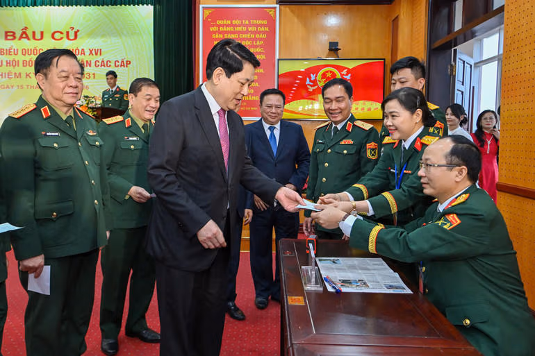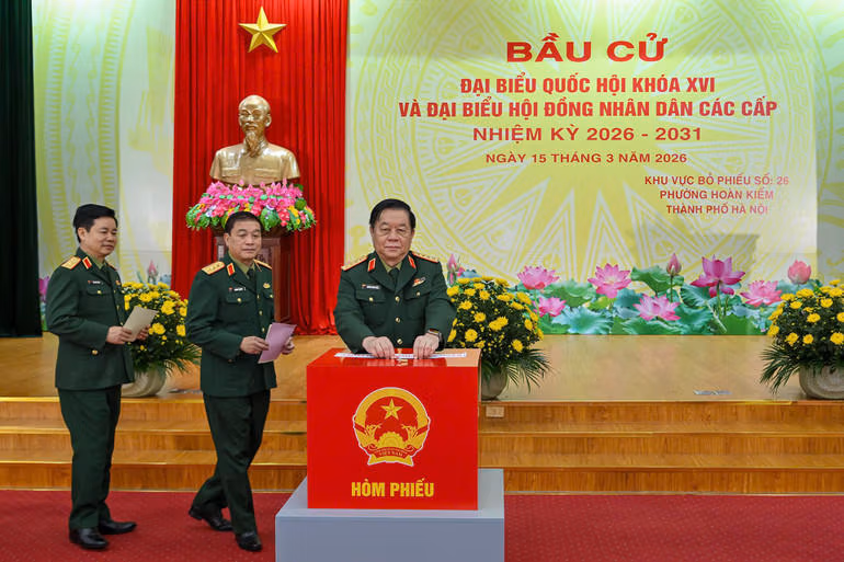 Đúng 7 giờ, ngay sau các nghi lễ khai mạc, Chủ tịch nước Lương Cường; Đại tướng Nguyễn Trọng Nghĩa - Ủy viên Bộ Chính trị, Bí thư Trung ương Đảng, Chủ nhiệm Tổng cục Chính trị Quân đội nhân dân Việt Nam cùng Thượng tướng Trương Thiên Tô, Ủy viên Trung ương Đảng, Phó Chủ nhiệm Tổng cục Chính trị; Thượng tướng Đỗ Xuân Tụng, Ủy viên Trung ương Đảng, Phó Chủ nhiệm Tổng cục Chính trị; Thượng tướng Lê Quang Minh, Phó Chủ nhiệm Tổng cục Chính trị Quân đội nhân dân Việt Nam đã bỏ những lá phiếu đầu tiên. Tiếp đó, đông đảo cử tri của khu vực bỏ phiếu số 26 đã lần lượt bỏ phiếu, thực hiện quyền và nghĩa vụ công dân của mình.