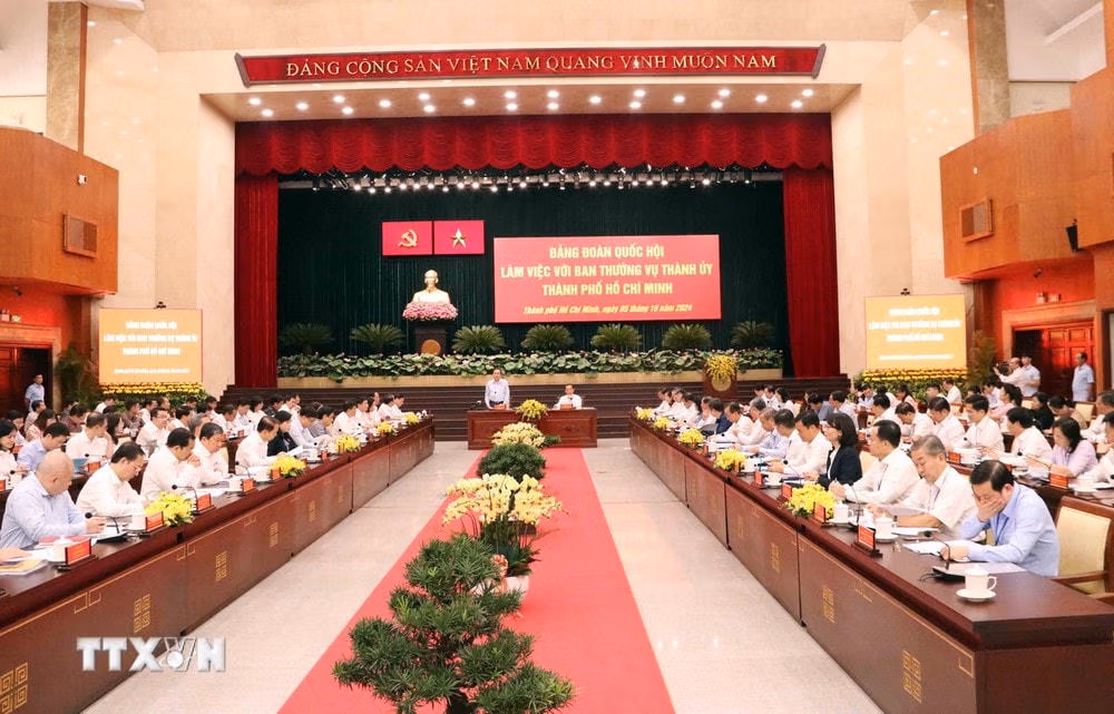 Vừa qua, Tổng Bí thư, Chủ tịch nước Tô Lâm, Thủ tướng Chính phủ Phạm Minh Chính đã làm việc và có nhiều chỉ đạo cụ thể với Thành phố Hồ Chí Minh về tình hình kinh tế-xã hội và định hướng phát triển của địa phương cũng như nhiệm vụ trọng tâm trong thời gian tới. Hôm nay, Đảng đoàn Quốc hội làm việc với Ban Thường vụ Thành ủy Thành phố Hồ Chí Minh. Điều này cho thấy Đảng, Nhà nước rất quan tâm đến sự phát triển về kinh tế-xã hội, đảm bảo quốc phòng an ninh, xây dựng hệ thống chính trị của thành phố.